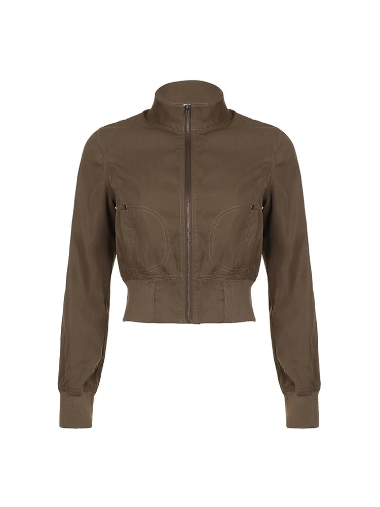 Brown Zip Up Stand Collar Pockets Long Sleeve Cargo Jackets Women Vintage Casual Streetwear