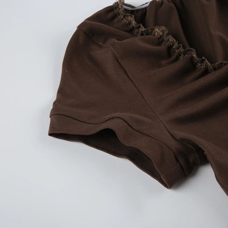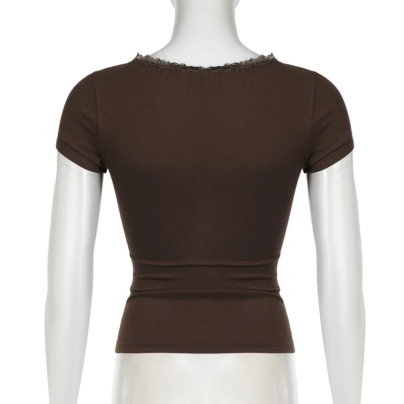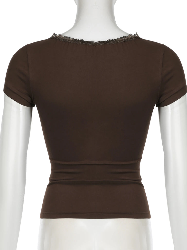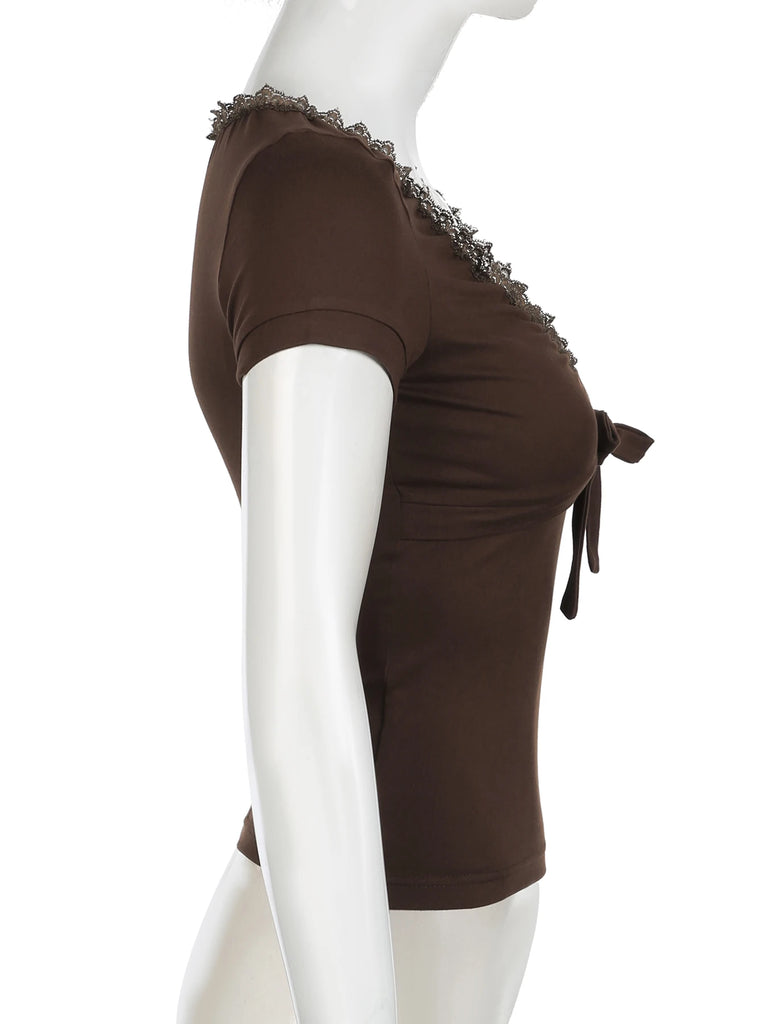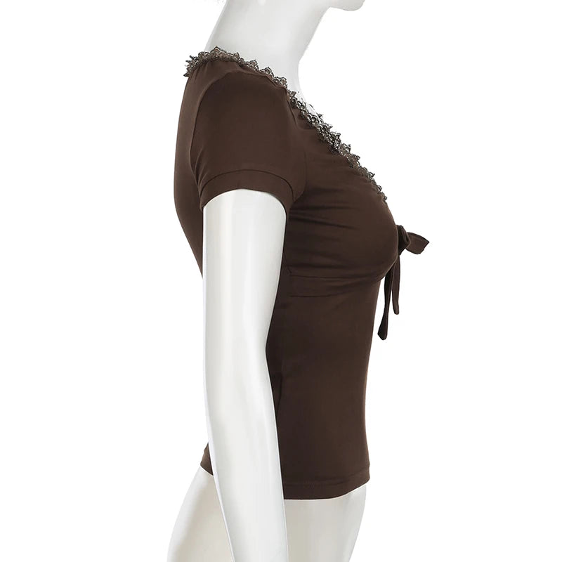 Casual Lace Trim Bandage T Shirt Slim Basic Deep V-Neck Short Sleeve Tees Women 2024 Summer Fashion Streetwear Ladies