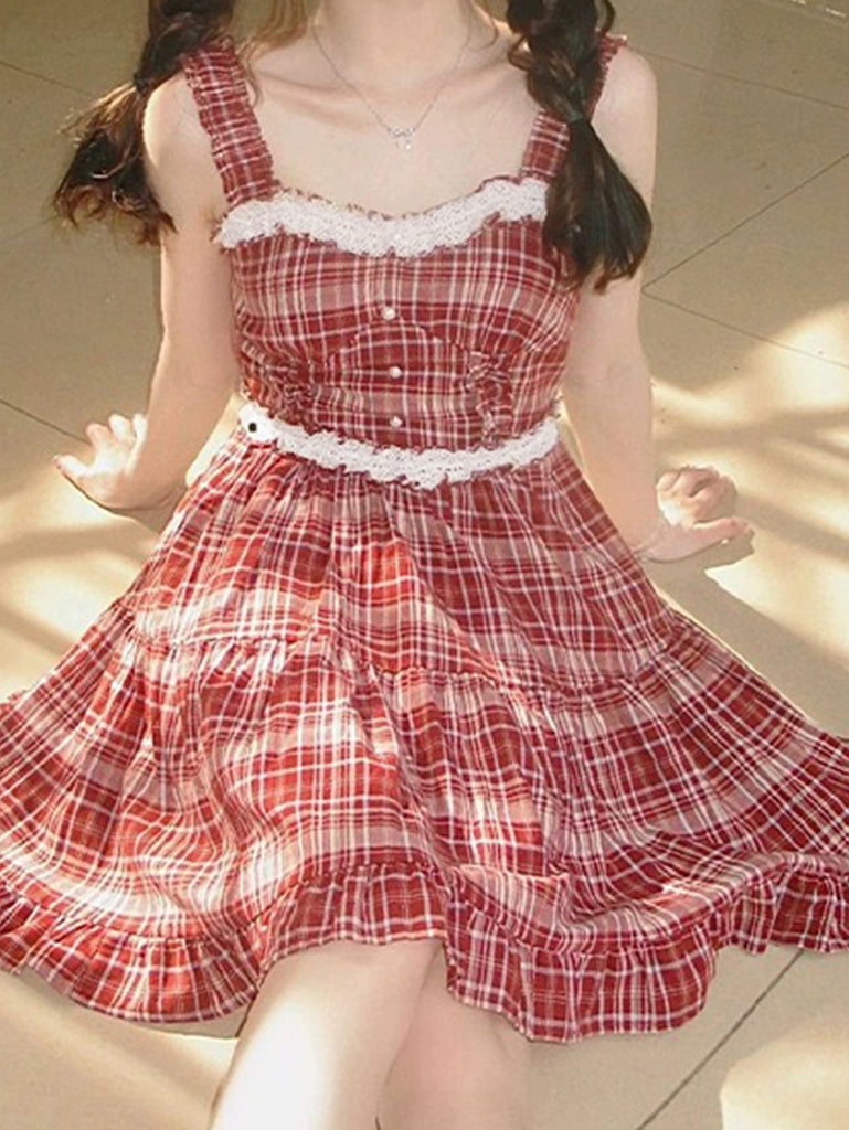 Chic French Vintage Ballet-Inspired Red & White Plaid Sundress with Lace Trim - Sleeveless, A-Line Mini Dress for Petite Women, Sweet & Spicy Style, Machine Washable