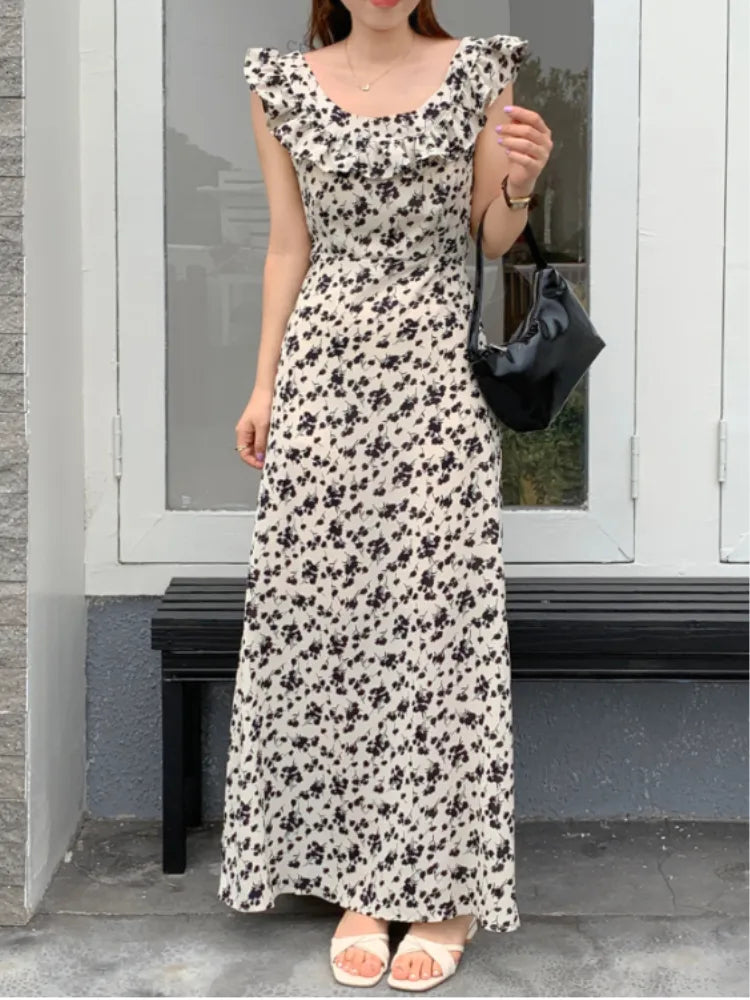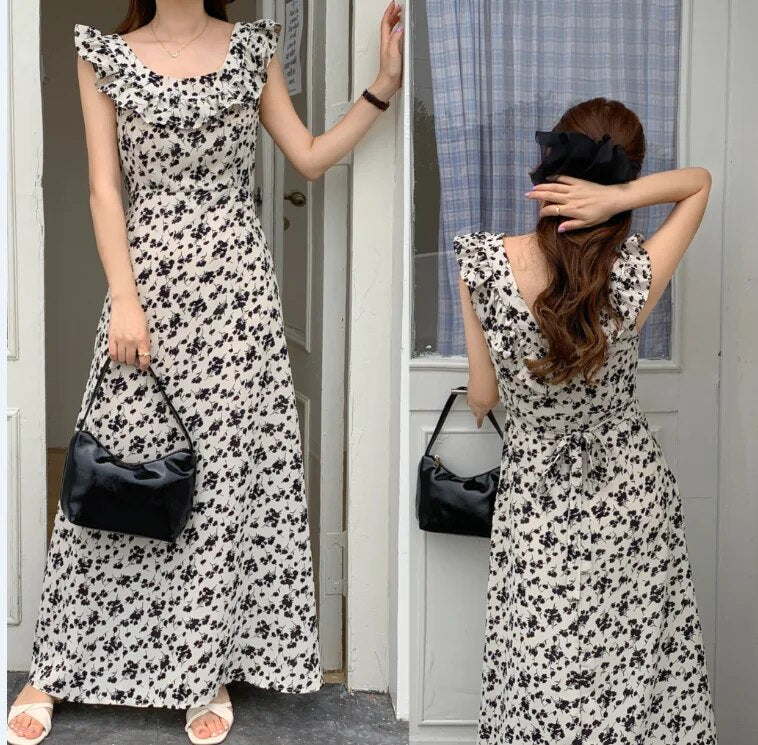 Chic Korean Clothes Design Autumn Women Sleeveless Japan Girls Cute Floral Printed Retro Vintage Date Black Long Maxi Dress