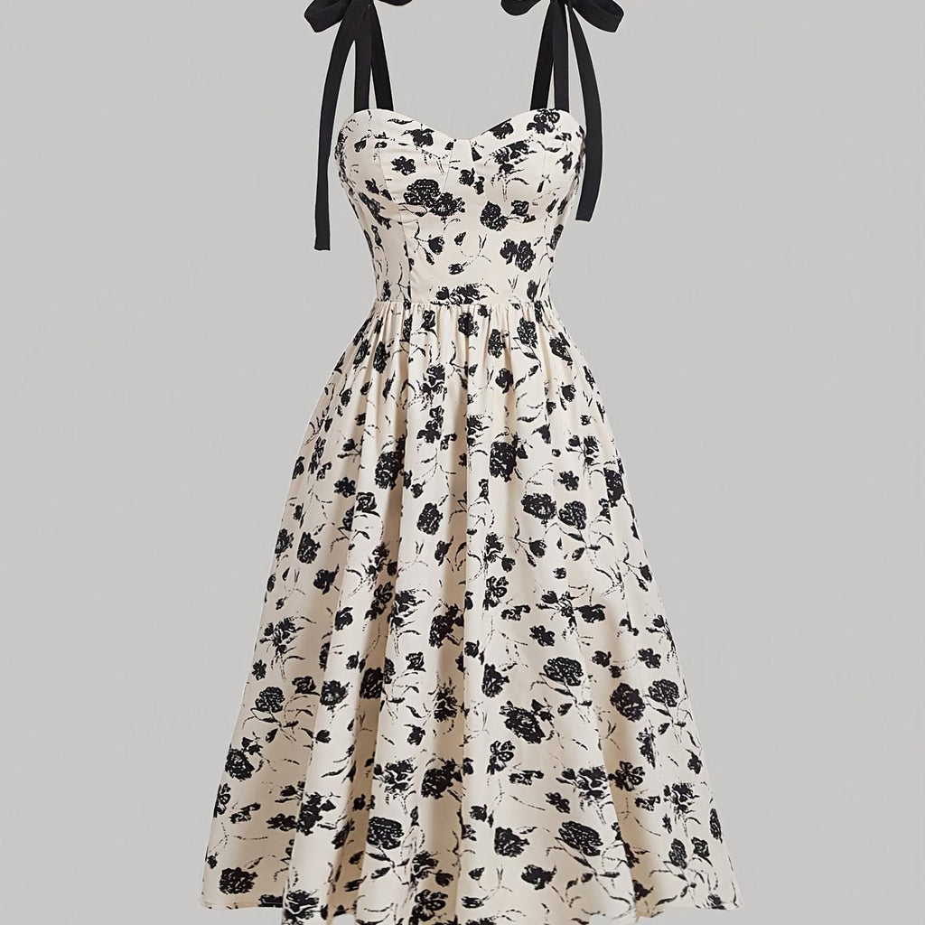 [Chic Midi V-Neck Floral Dress] Women'S Elegant V-Neck Floral Print Dress with Tie Straps, Polyester Knit Fabric, A-Line Silhouette, All-Season Chic Midi Dress for Adult