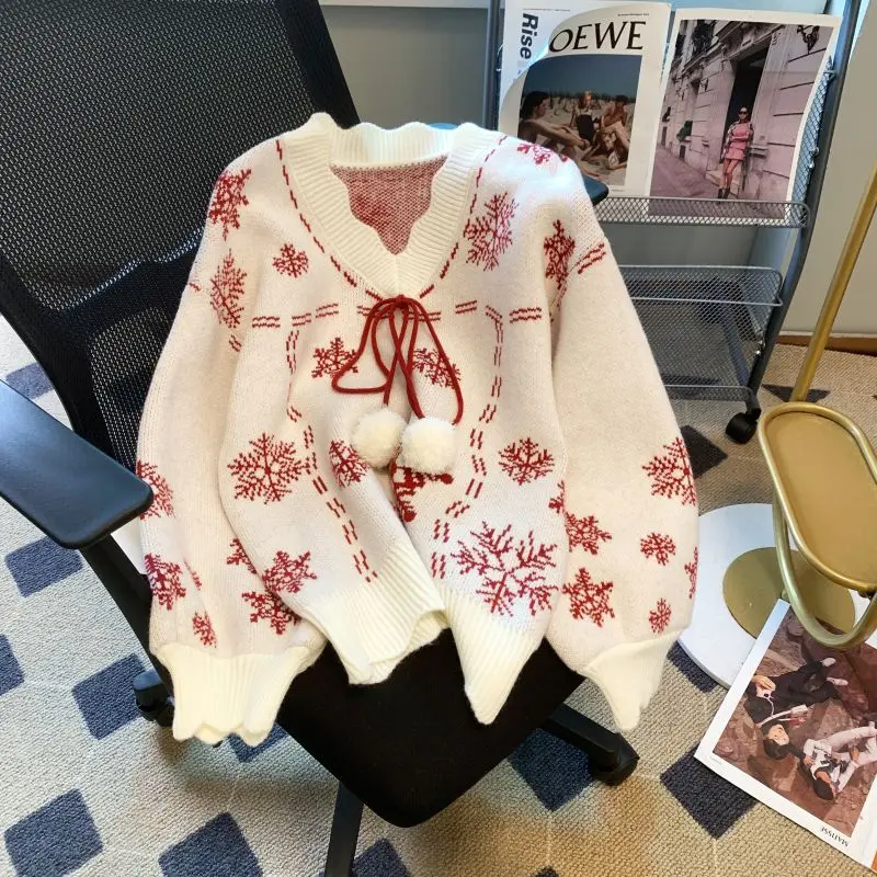 Christmas New Red Autumn and Winter Pullovers Snowflake Knitted Sweaters Thick Loose V-neck Hooded Sweet Long Sleeve Top Trendy