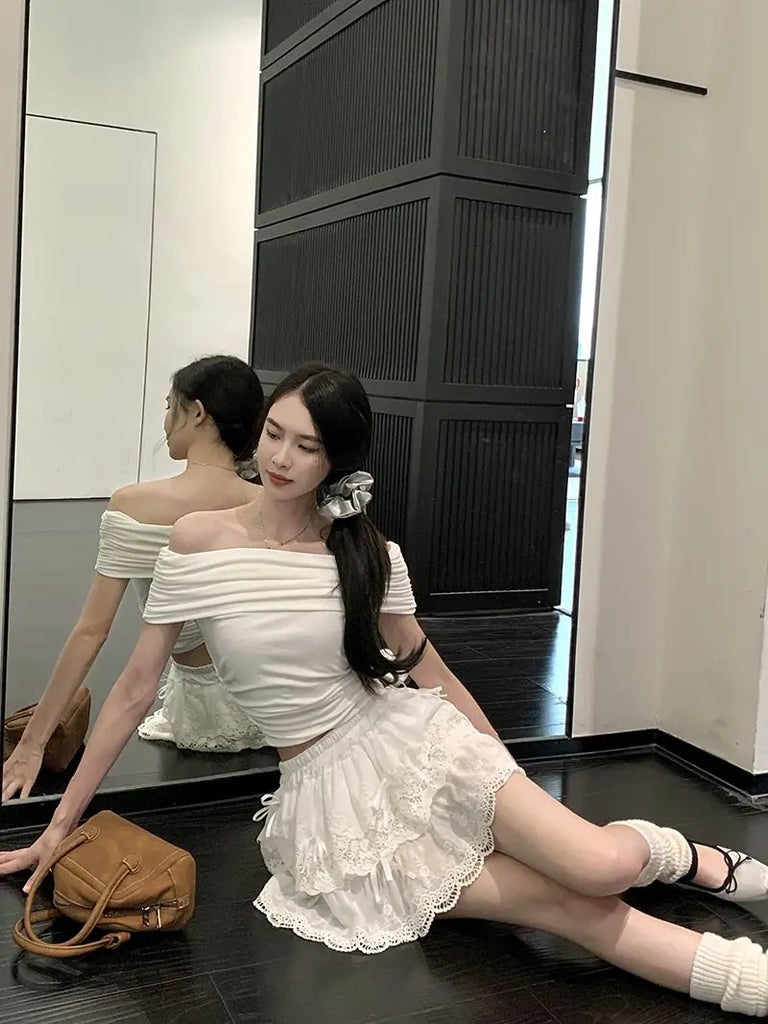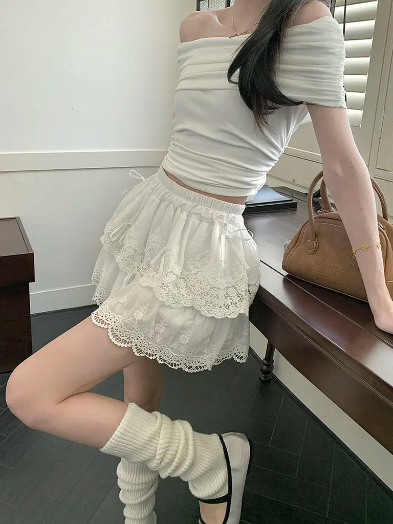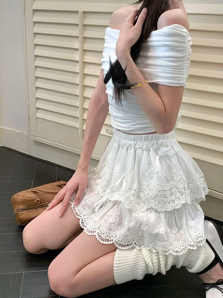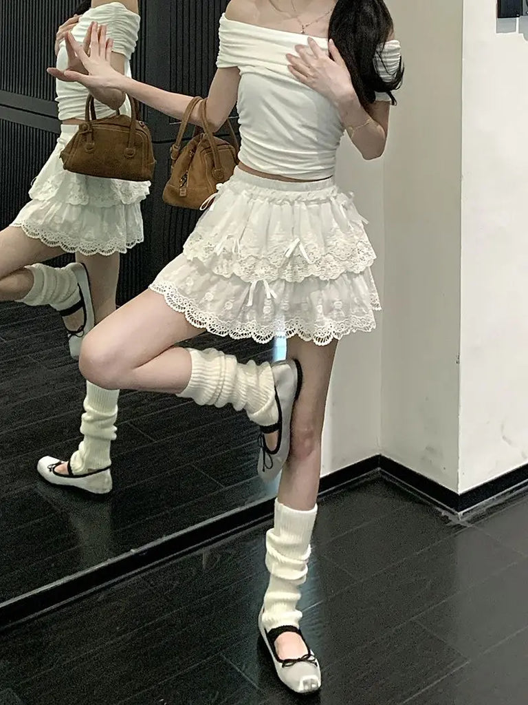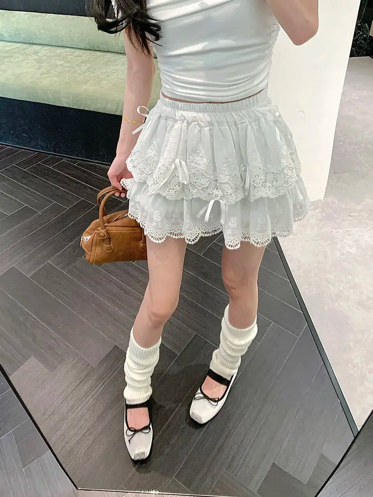 Coquette White Lace Short Skirt Ruffle Women Sweet Bow Kawaii Mini Skirts Patchwork Layered A-line Aesthetics Skirt