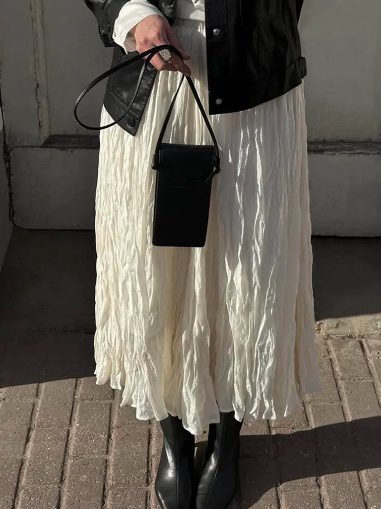 Crinkle Pleated Midi Skirts for Women Summer Clothes Elastic High Wasit A Line Fashion Skirt Female Vintage Elegant Long Skirt