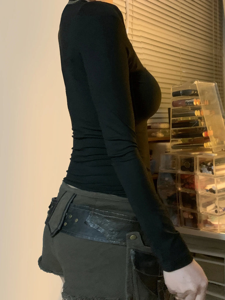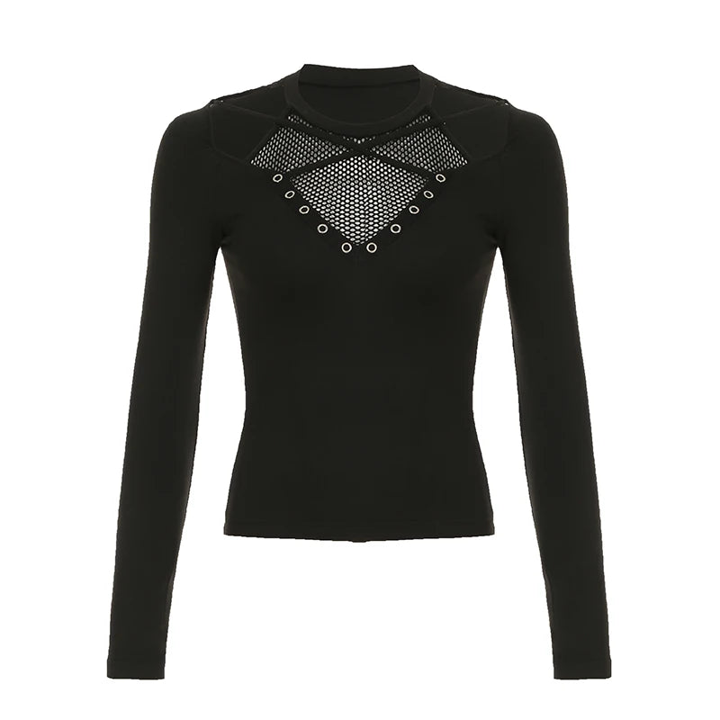 Darkly Punk Cothic Women Long Sleeve T-Shirt Patchwork Chic Fabric Cut Out O-Neck Top Tees Slim Sexy Solid Tops