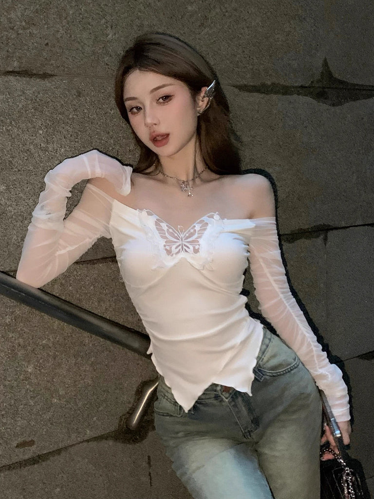 Korean Style Off Shoulder T Shirts Women Aesthetic Butterfly Cropped Mesh Tops Sexy Coquette Y2k Kpop Long Sleeve Tees