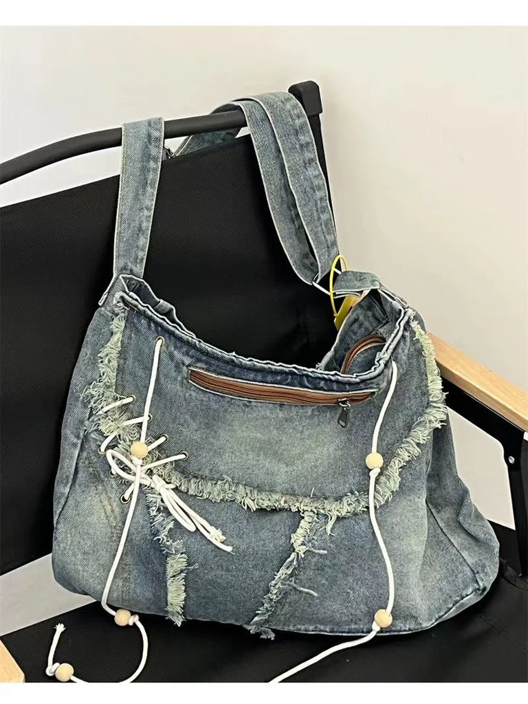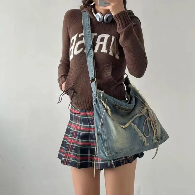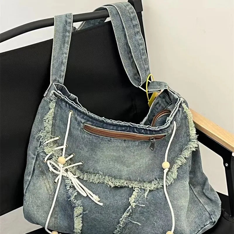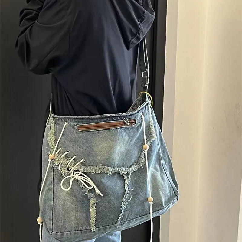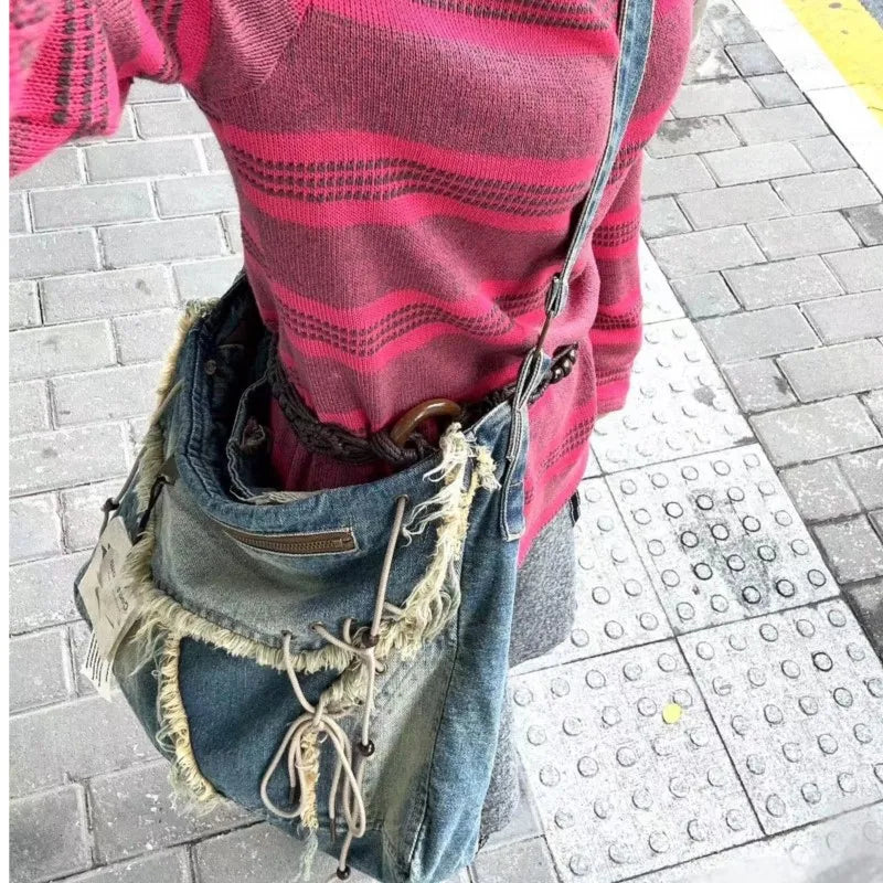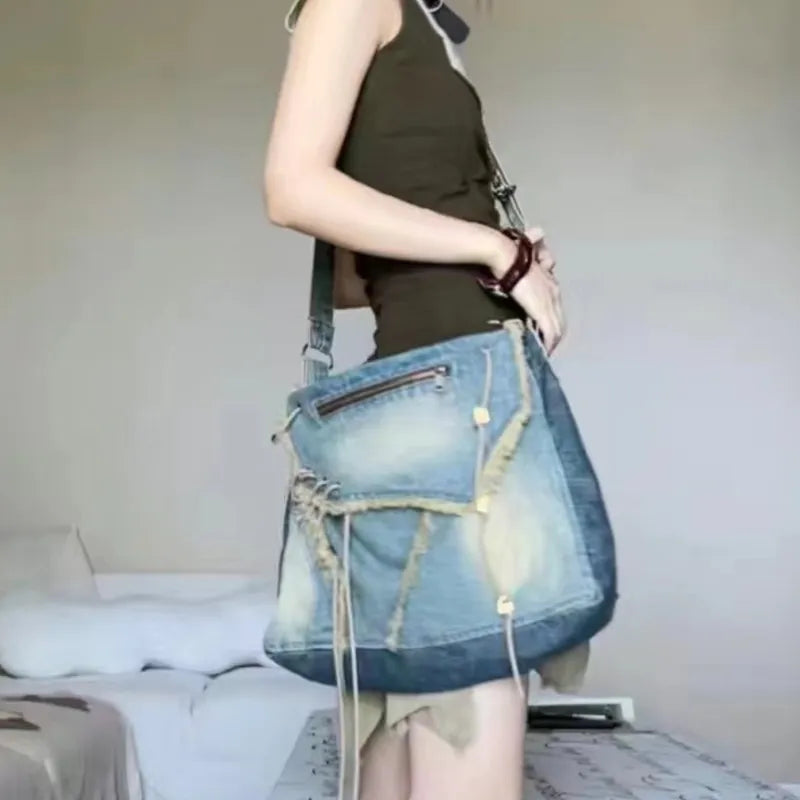Denim Crossbody Bag Women Y2k Grunge Vintage Aesthetic Tassel Casual Messenger Bag Female Harajuku Retro Solid Handbag