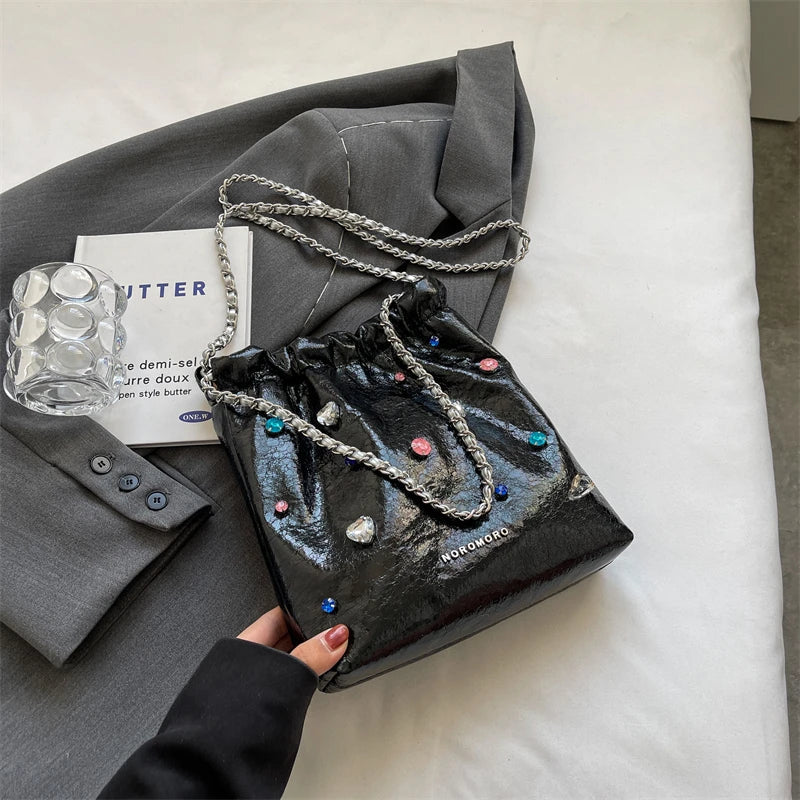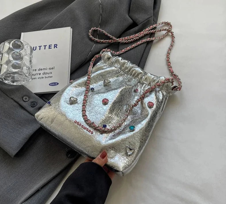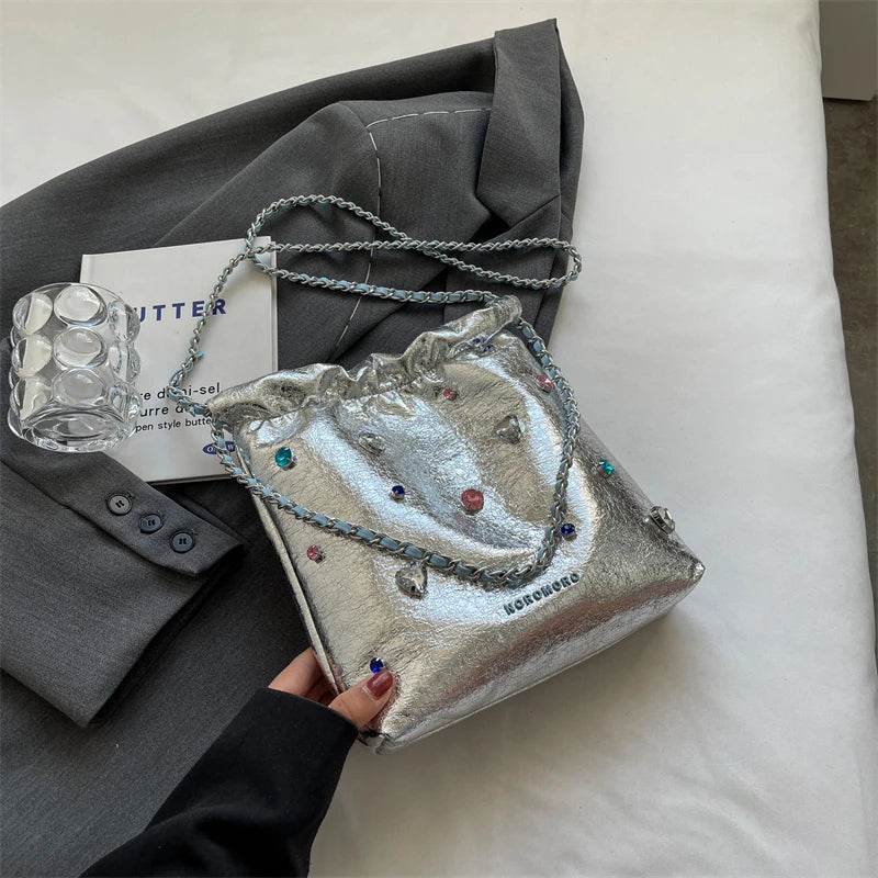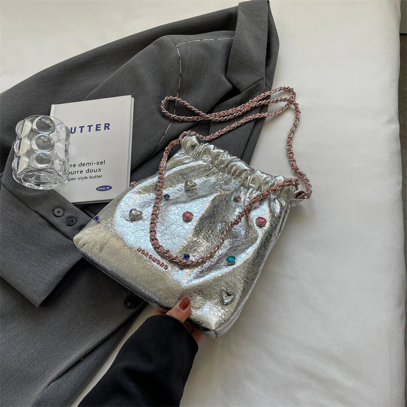 Diamonds Design Silver Leather Crossbody Bags for Women Luxury Designer Korean Fashion Chain Shoulder Bag Handbags