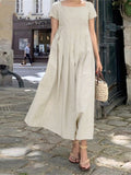 Dress for Women Cotton Blended Long Skirt Large Swing Sun Skirt Short Sleeve Square Neck Elegant Casual Long Pure Color Dress