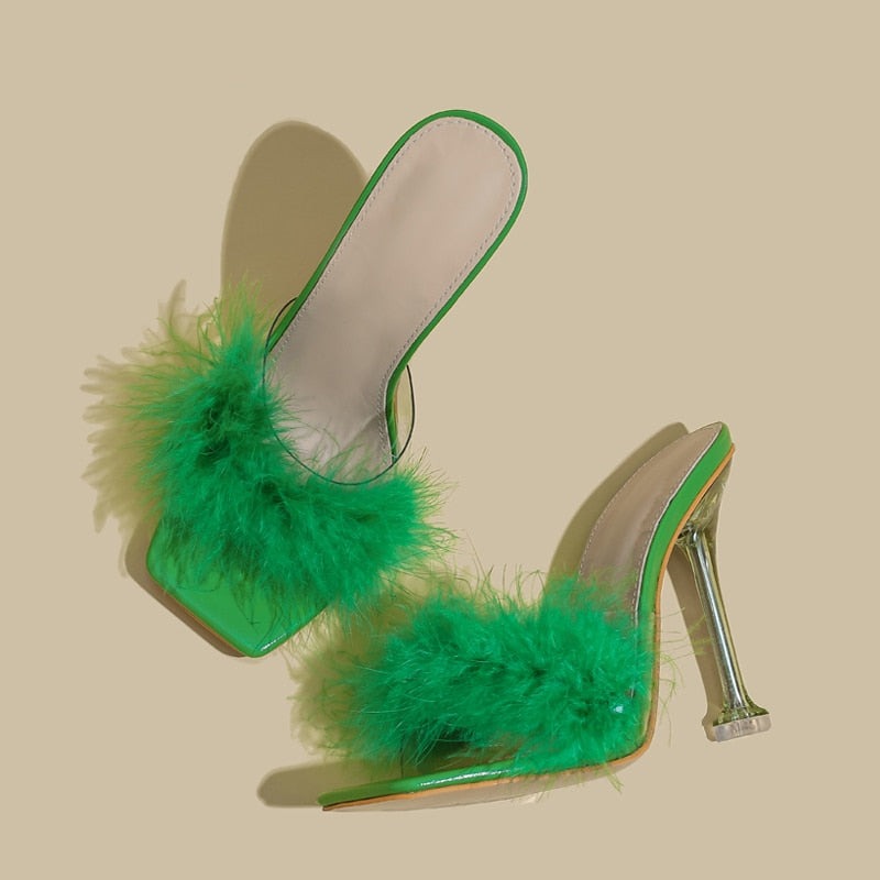PVC Shoes Slippers Woman Feather Transparent High Heels Fur Pumps Square toe Mules Lady Slides