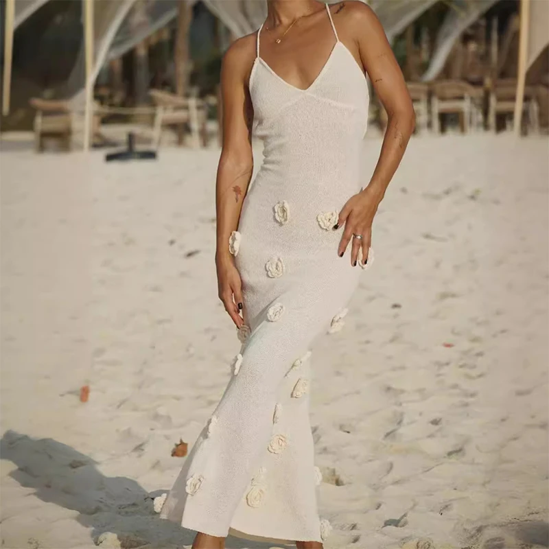 Elegant 3d Flower Sling Maxi Dress Women Deep V-neck Sleeveless Beach Dresses Summer New White Lady Chic High Street Robes