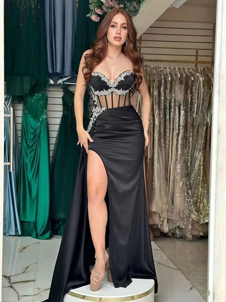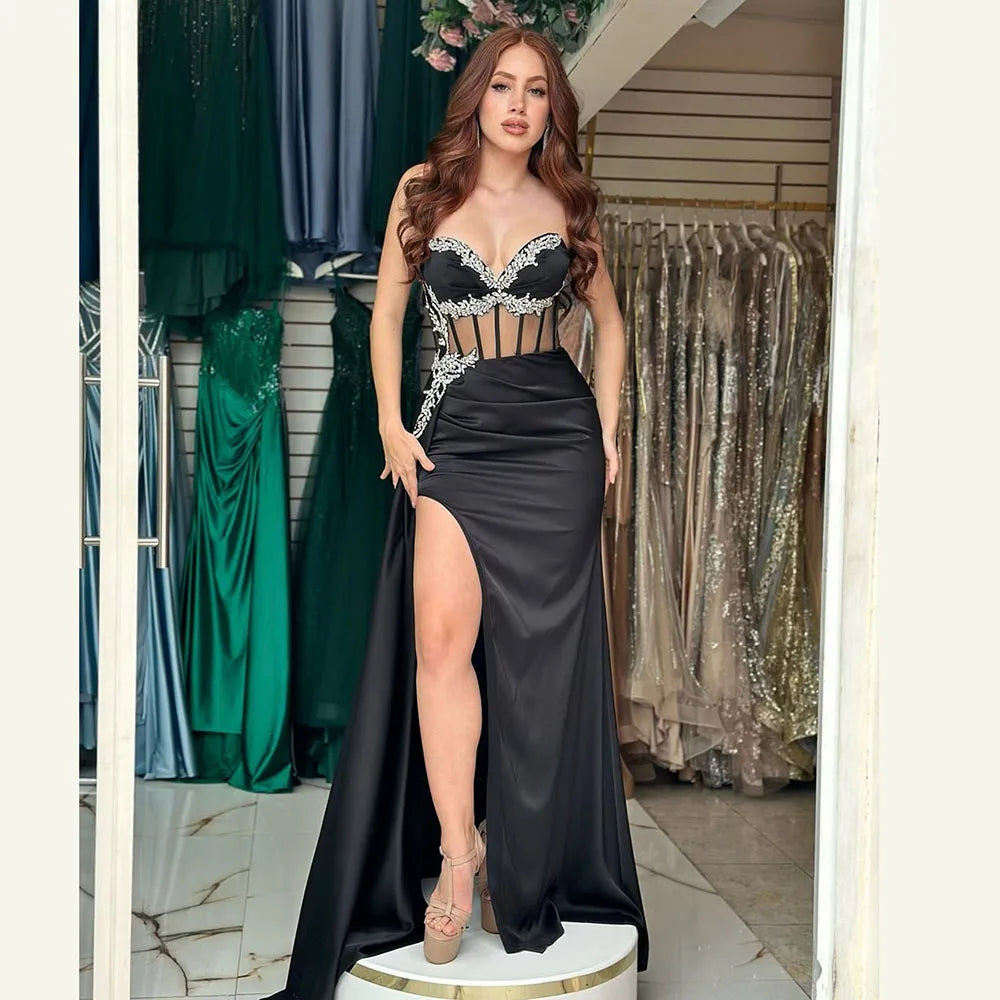 Elegant Black White Strapless Formal Gown Gala Mermiad Prom Dress Draped Train Evening Gown Party Wear Dress Customized