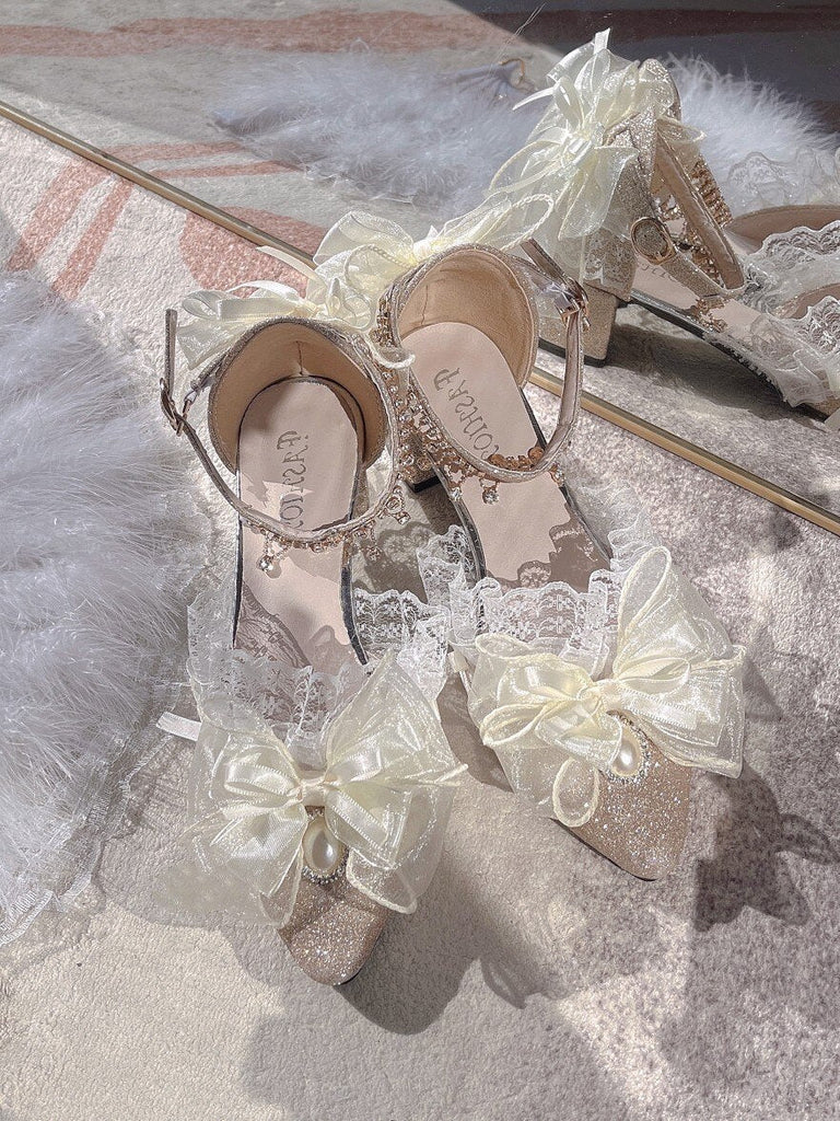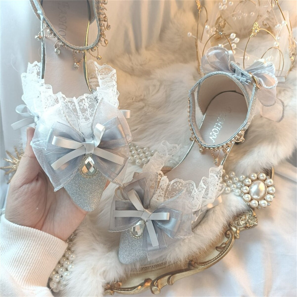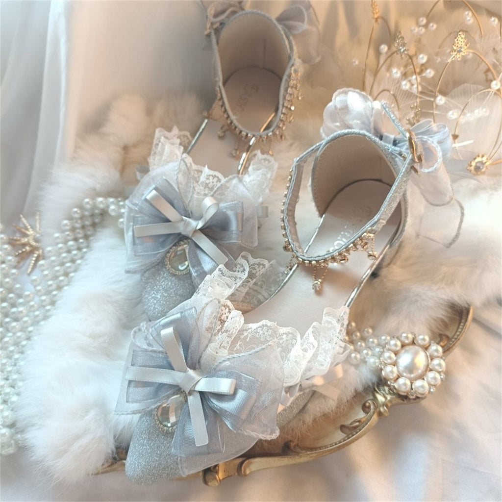 Elegant Retro Style Lolita Cosplay Tea Party Girl Shoes Pointed Lace Ruffled Ribbon Bow Flower Pearl Gem 4.5cm High Heeled Shoes