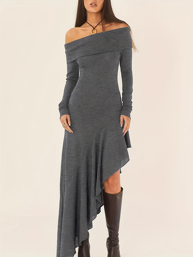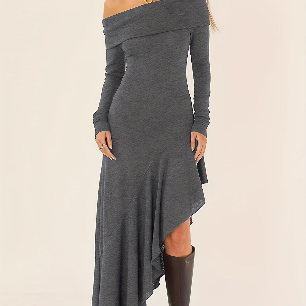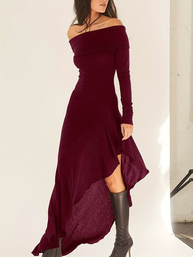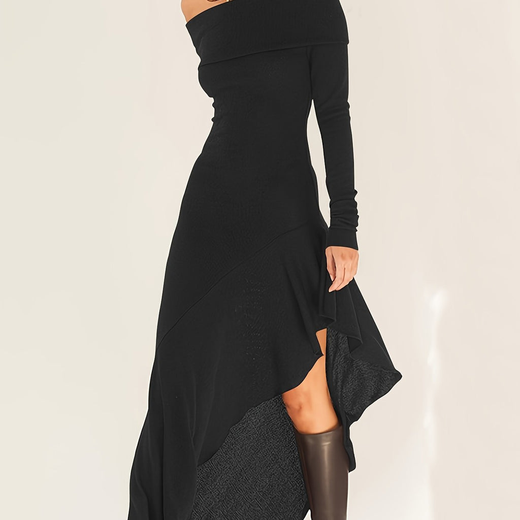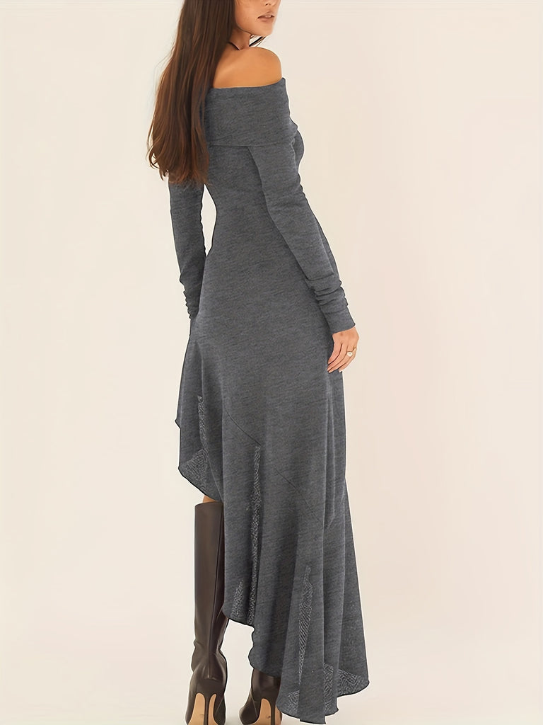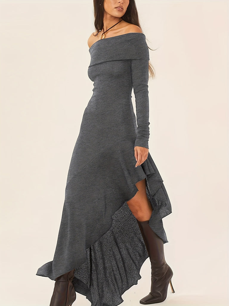 Elegant Ruffled Off Shoulder Long Sleeve Dress - Women's Backless Asymmetrical Slim Fit Dresses with Ruffle Hem - Perfect for Formal Occasions and Date Nights
