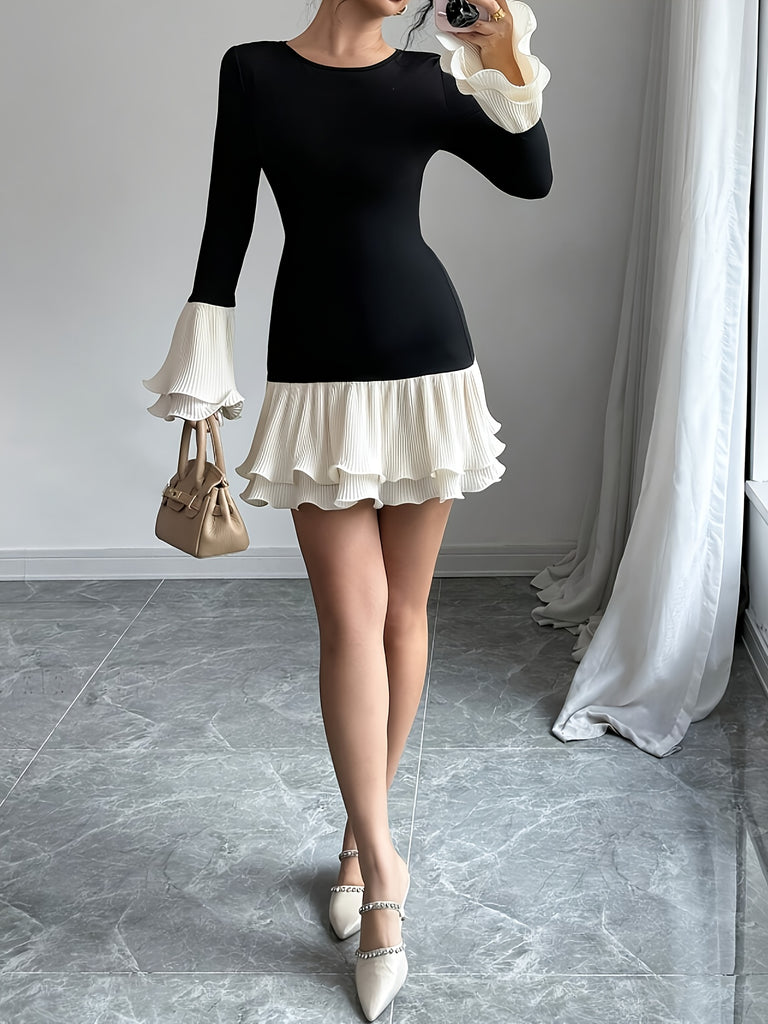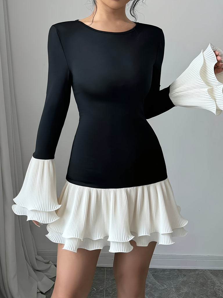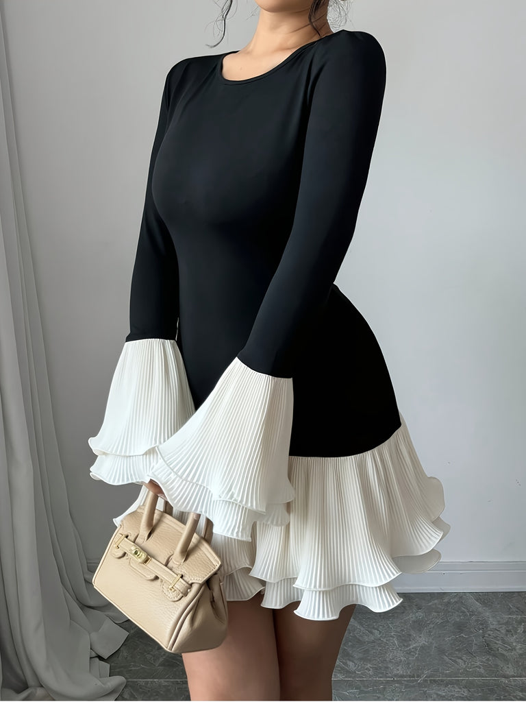 Elegant Two-Tone Ruffle Hem Dress for Women - Chic Long Sleeve, Crew Neck, Stretchy Polyester Blend, Machine Washable - Perfect for All Seasons, Sophisticated Outfit|Puffed Sleeves|Polyester Elastane Fabric