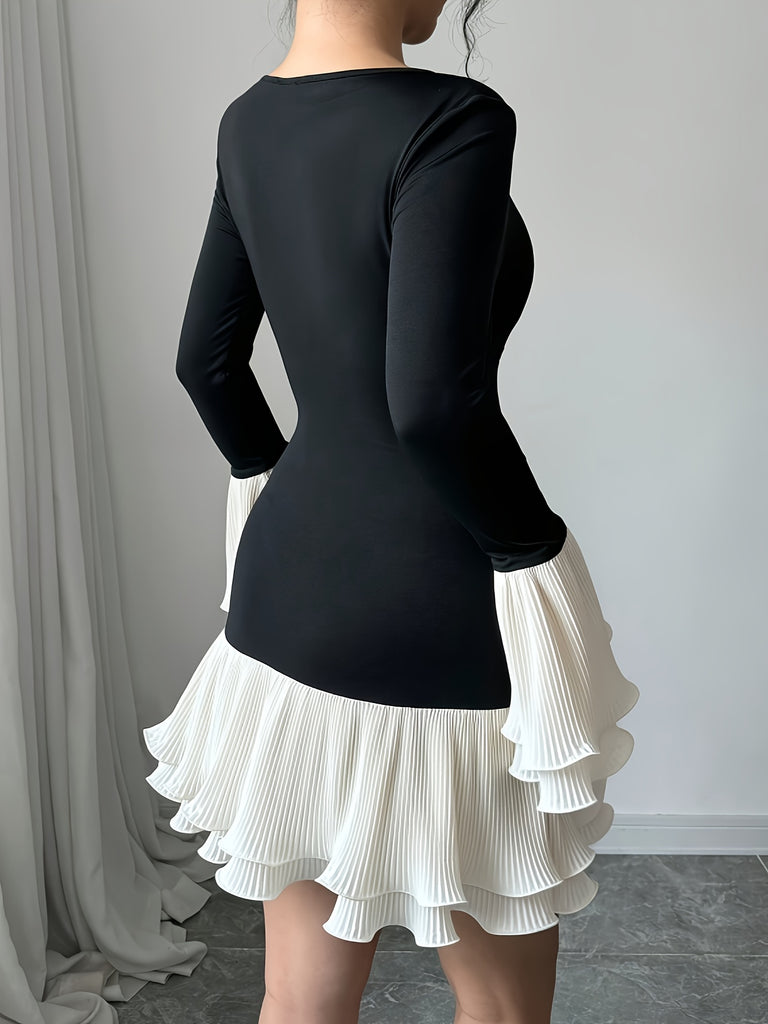 Elegant Two-Tone Ruffle Hem Dress for Women - Chic Long Sleeve, Crew Neck, Stretchy Polyester Blend, Machine Washable - Perfect for All Seasons, Sophisticated Outfit