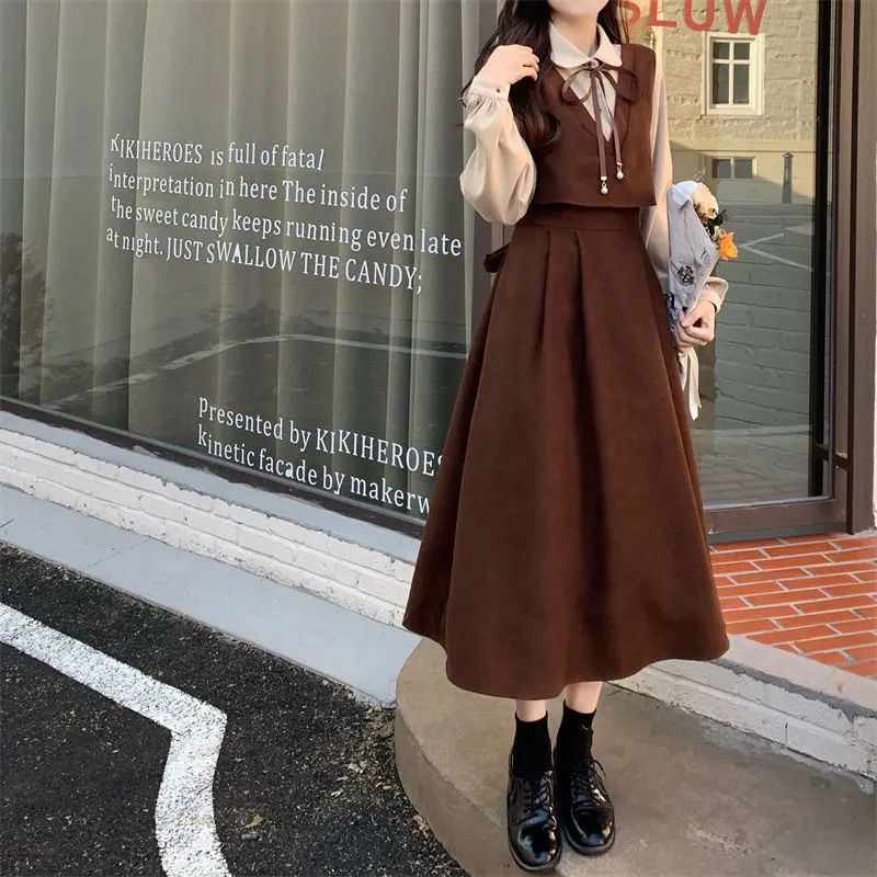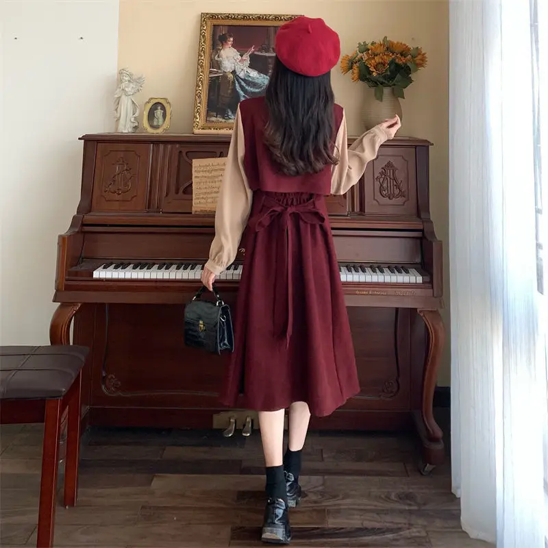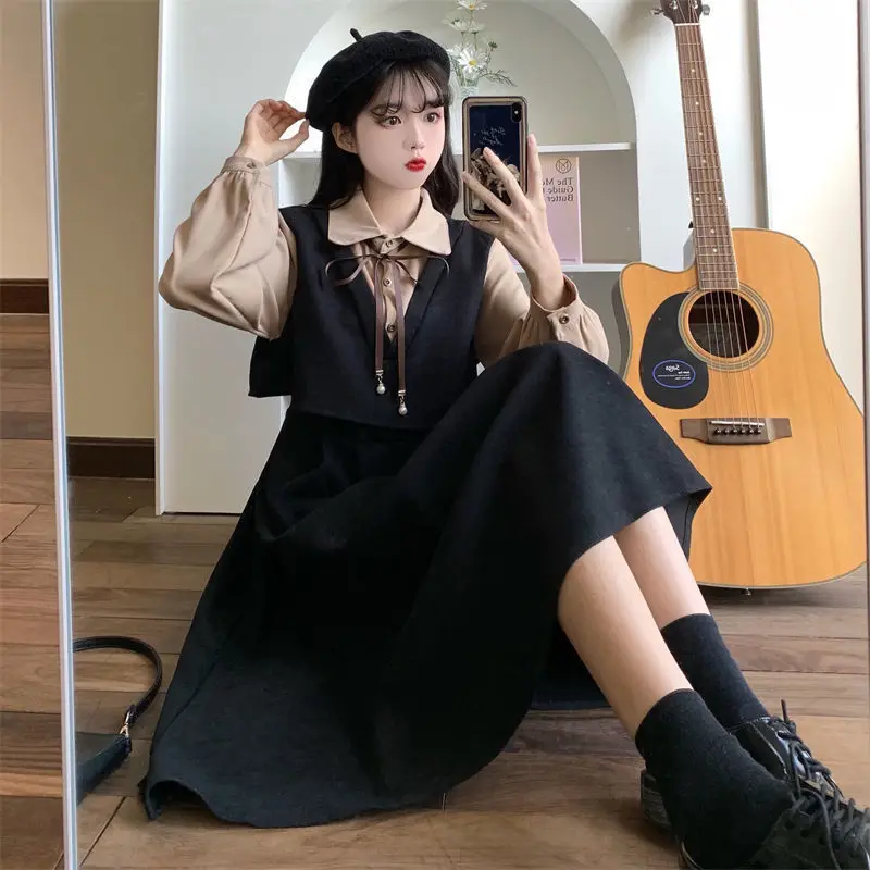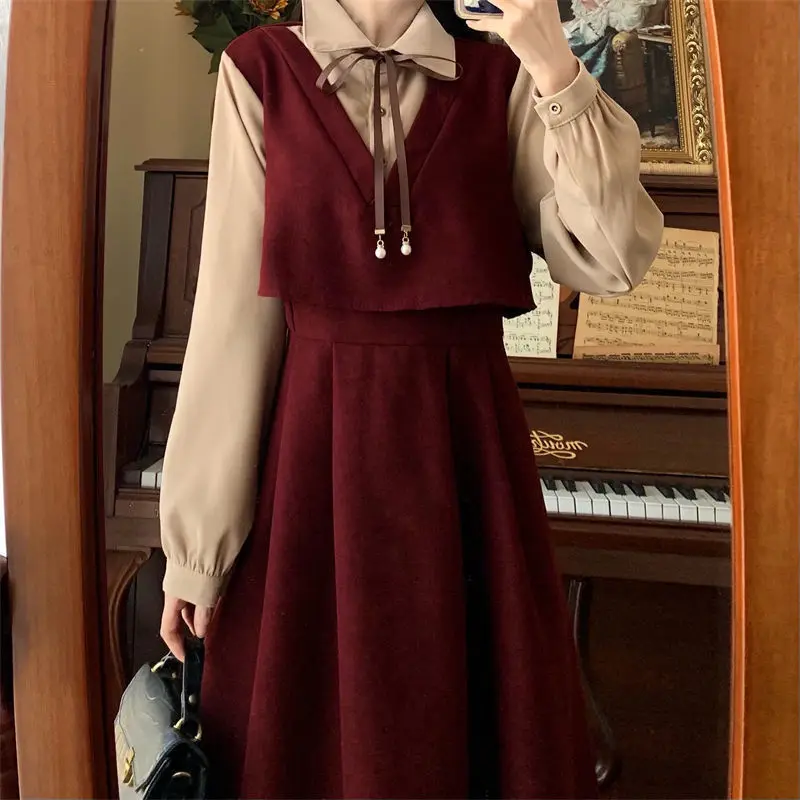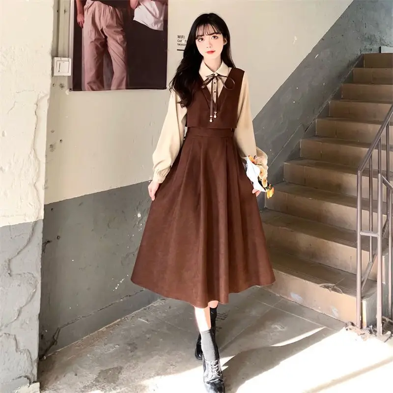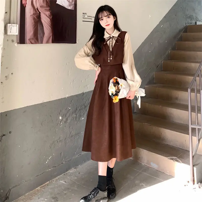 Elegant Vintage Long Dress Women Preppy Style Patchwork Long Sleeve Dresses Kawaii Peter Pan Collar Autumn Robe