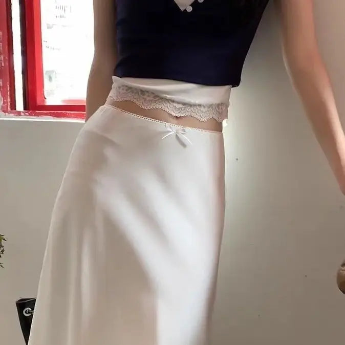 Elegant White Women Satin Skirt Fairycore Ruffle Mid Skirts Coquette A-line Basic Casual Korean Style Summer Silk Skirt