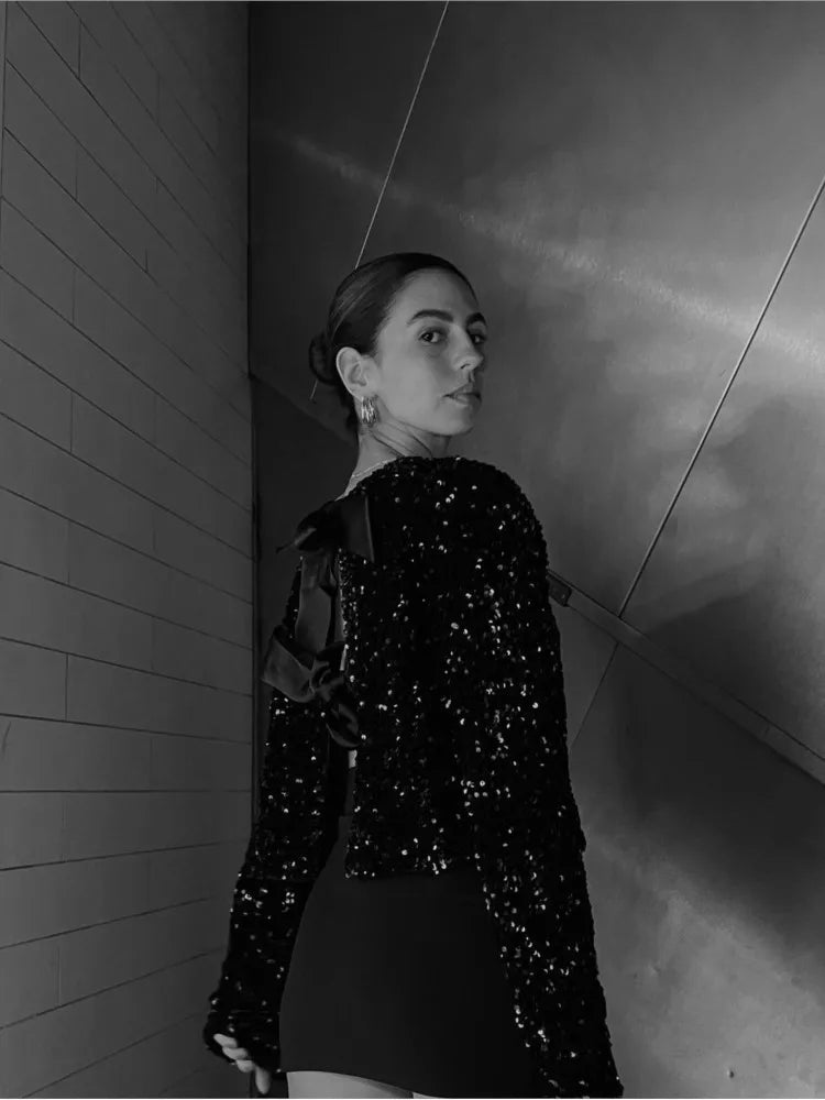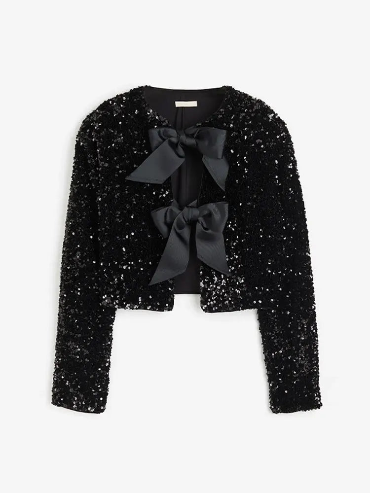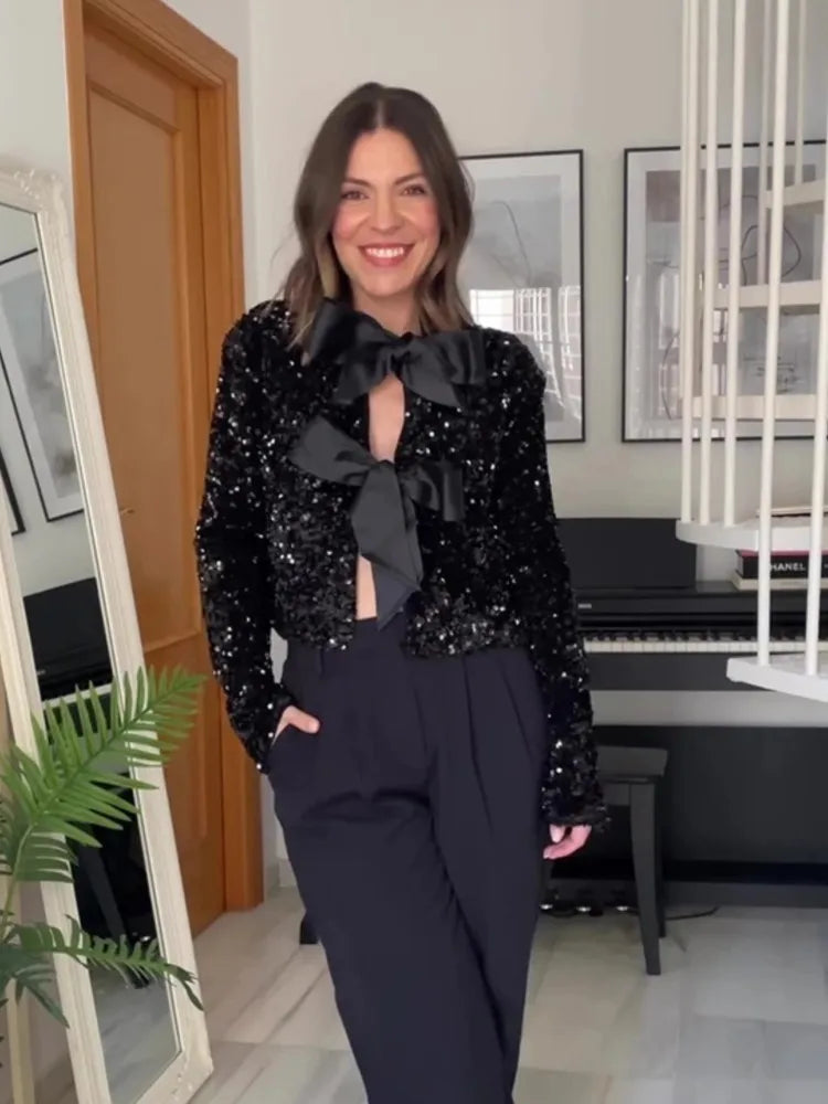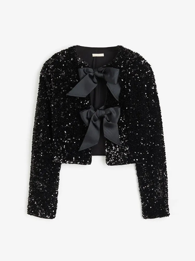 Fashion Sequin Bow Lace Up Women Jacket Chic Shiny O-neck Long Sleeve Y2k Cropped Coat Female Solid Party Outerwear