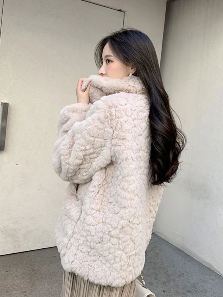 Faux Lamb Vintage Coat Women Long Sleeve Winter Warm Sweet Jacket Korean Casual Female Pockets Solid Slim Retro Outwear Top