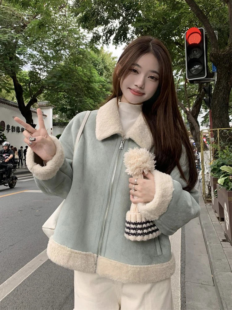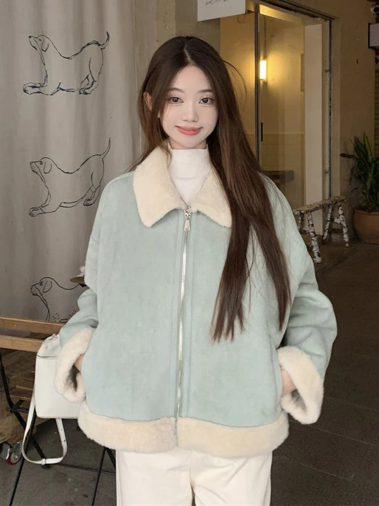 Faux Suede Lamb Jackets Women Winter Warm Thick Sweet Cute Short Coat Korean Vintage Loose Long Sleeve Preppy Style Tops