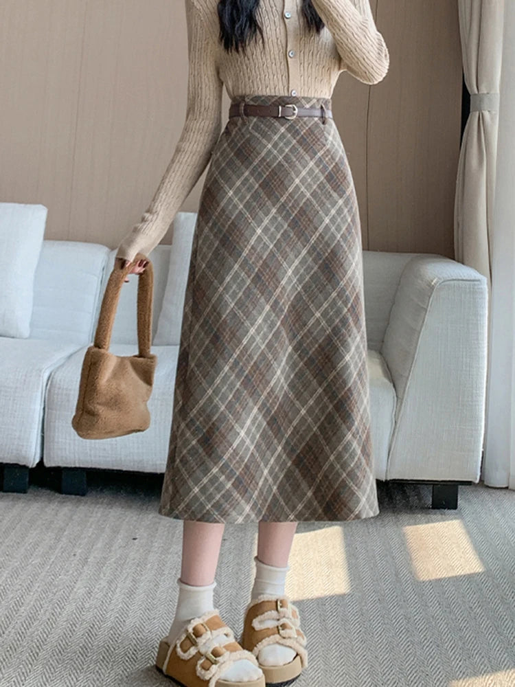 Faux Woolen Plaid Long Skirt Women Vintage Slim High Waist Back Slit Belt Skirts Korean Fall Winter Elegant Long Skirts New