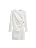 Female Summer Vintage Mini Dresses White O-Neck With Ruched Long Sleeve Zipper Elegant And Pretty Women's Sheath Dresses