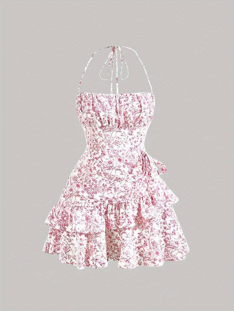 [Floral Print Halter Dress] Floral Print Layered Ruffle Hem Halter Dress, Elegant Sleeveless Dress For Spring & Summer, Women's Clothing