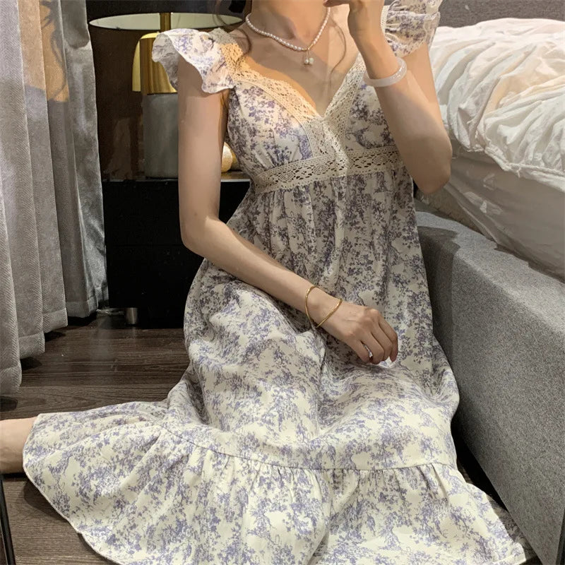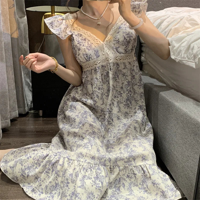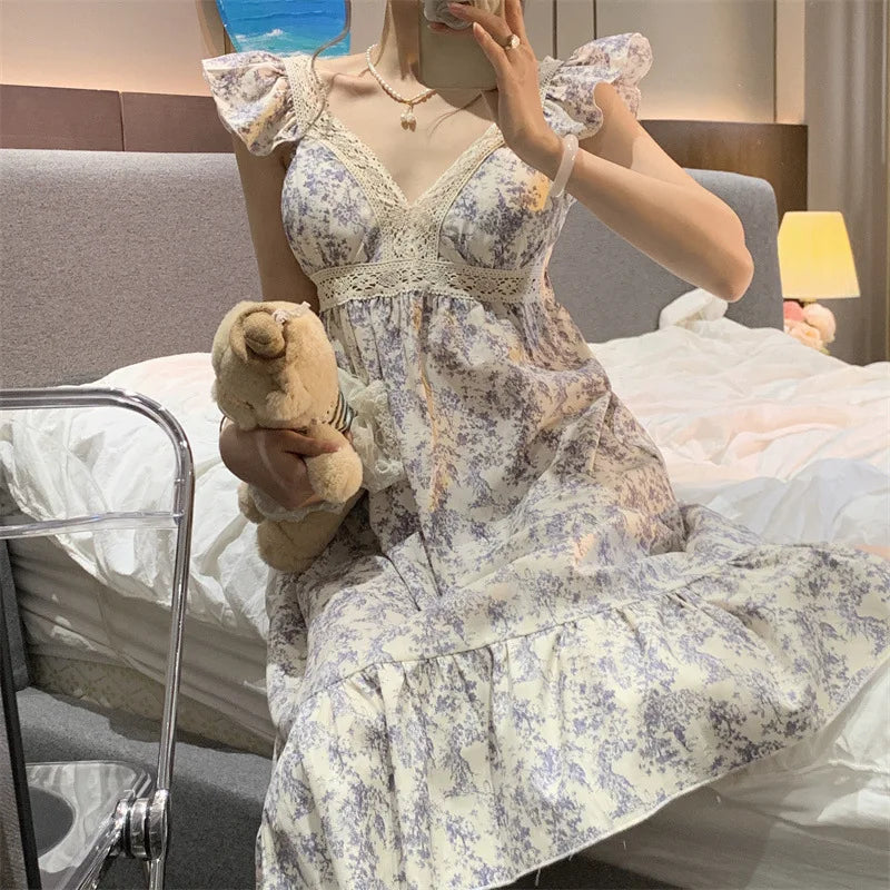 Floral Print Sleepwear Womens with Pad Nightgown Korean Vintage Ruffles Night Dress One Piece Pajama Summer V-neck Home Wear New