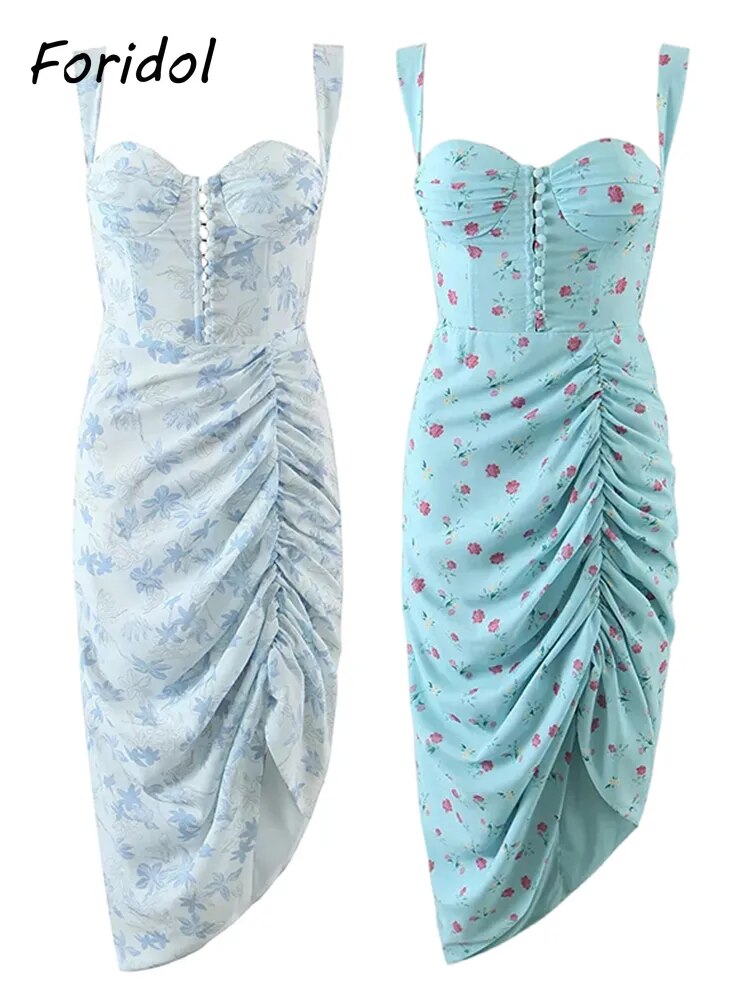 Foridol Side Ruched Button Up Vintage Boho Summer Dress Women Sleeveless Tank Slip Maxi Dress Blue Floral Chiffon Beach Dress
