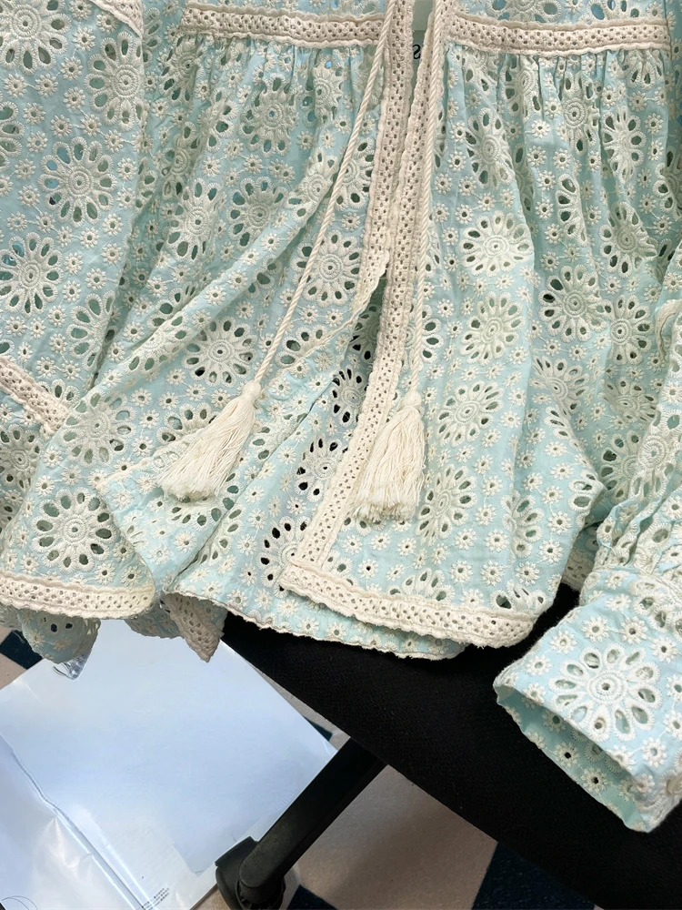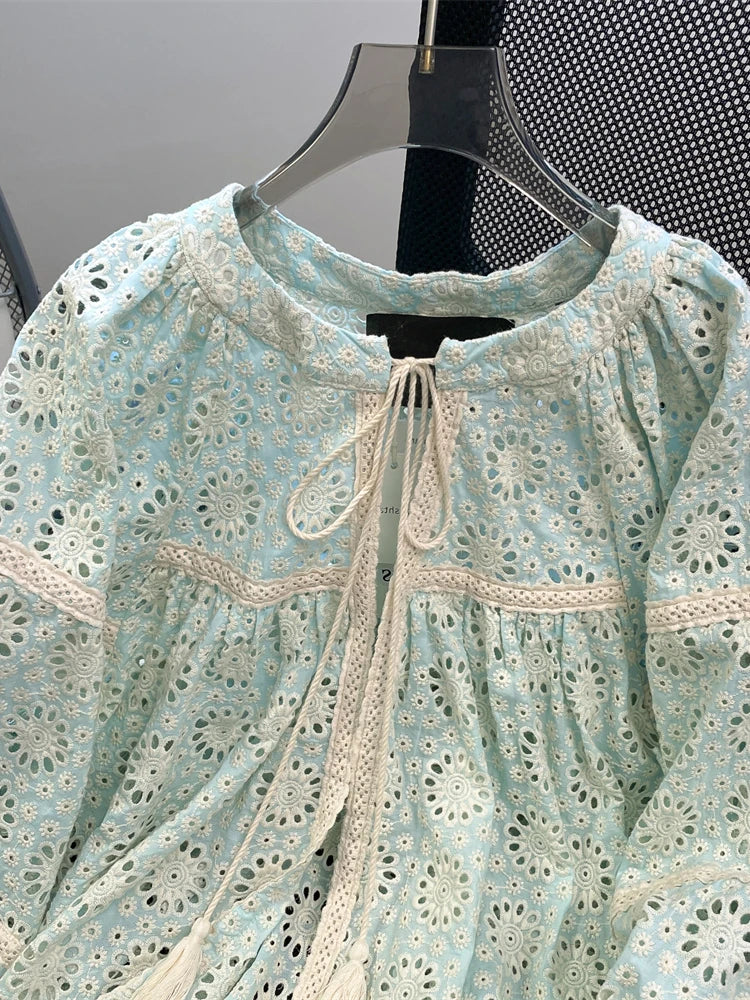 French Design Blouses Hollow Out Embroidery Long Sleeve Patchwork Lace Up Shirts Casual Loose All Match Elegant Women Clothing
