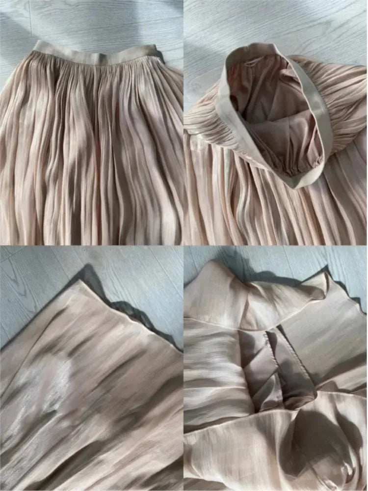 French Elegant Solid Silky Shiny Long Skirt Fashion Elastic Waist Satin Pleat Women Dress Spring Korean Chic A-line Ladies Skirt