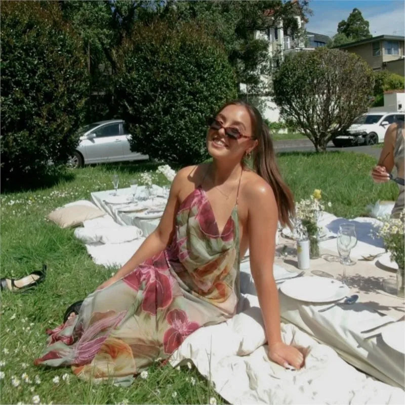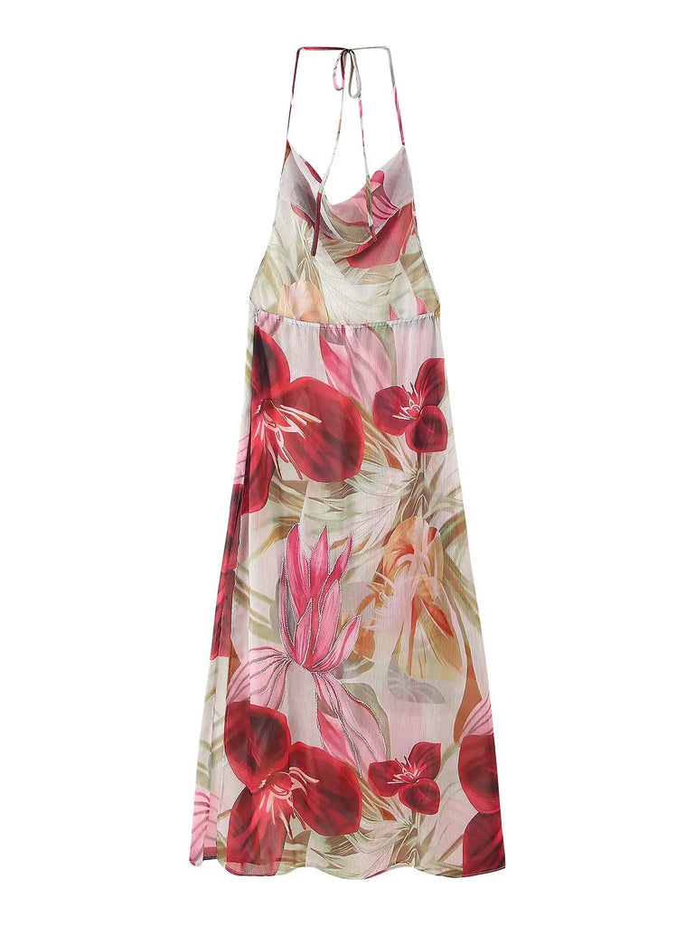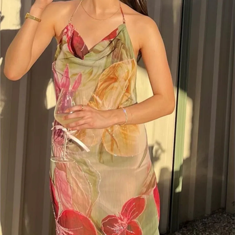 French Fashion Beading Embroidered Chiffon Slip Dress Vhalter Neck Backless Flower Print Vacation Beach Summer Women Dress