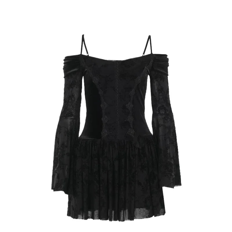 Goth Black Lace Flocking Off-Shoulder Flared Sleeve Party Dresses Y2K Vintage Velvet Patchwork A-Line Mini Dress Women