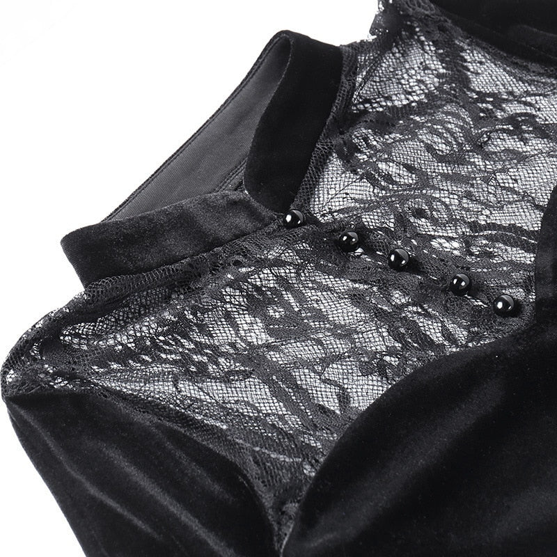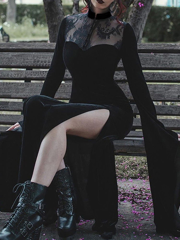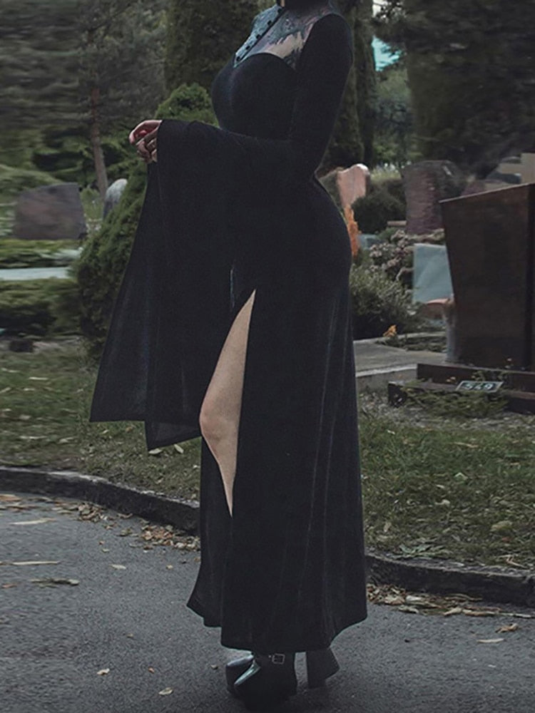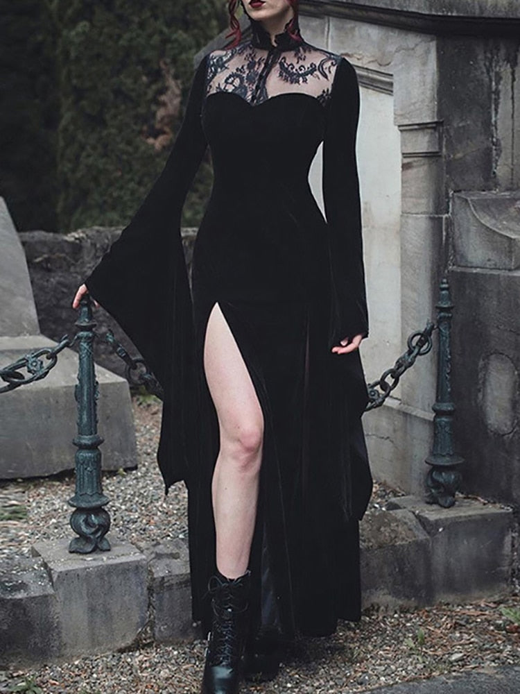 Goth Dark Velvet Vampire Witch Mall Gothic Long Dresses Vintage Elegant Grunge Lace Patch Dress Flare Sleeve Halloween Partywear