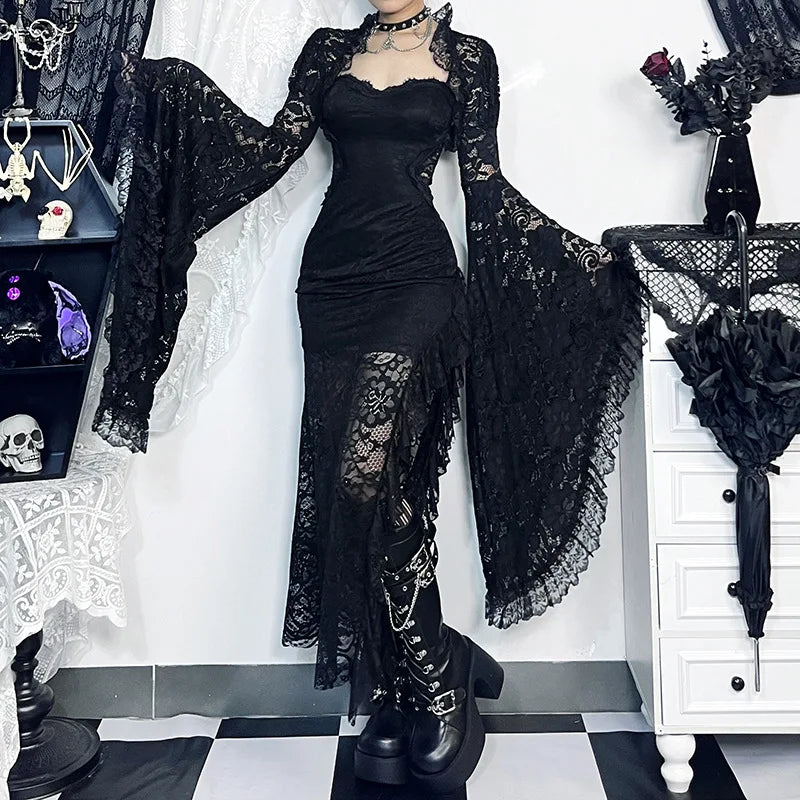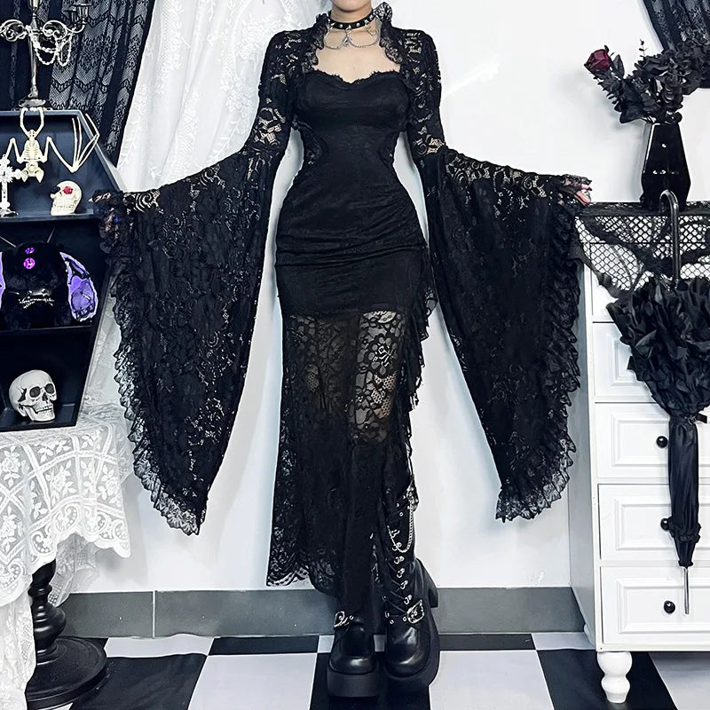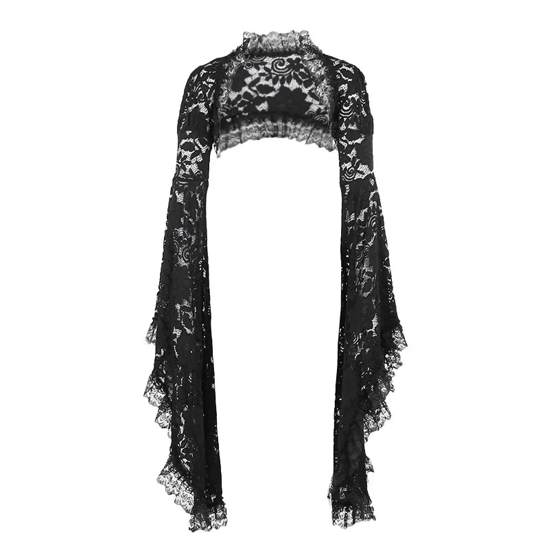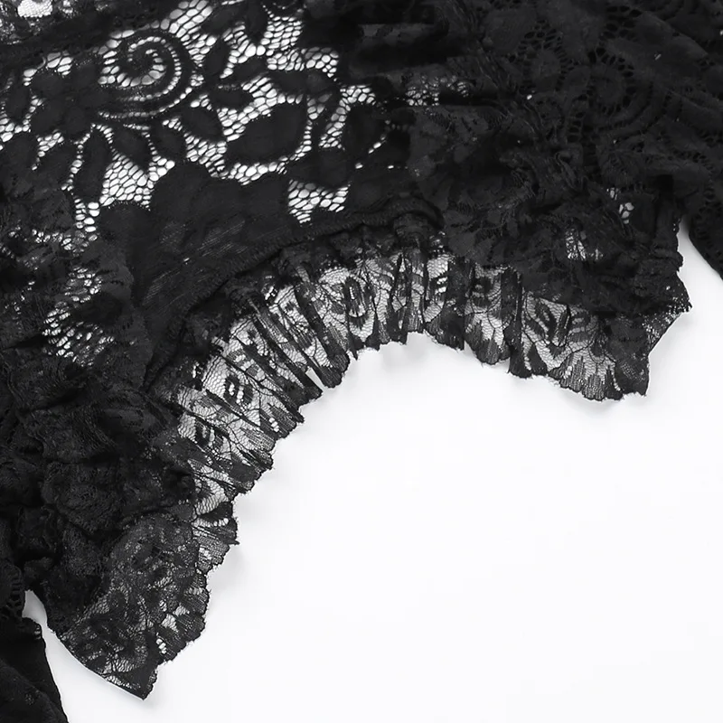 Gothic Classic Lace Cover Ups Women Mesh Crop Top See Through Sexy Flare Sleeve Blouse Y2k Black Rave Outfit Festival