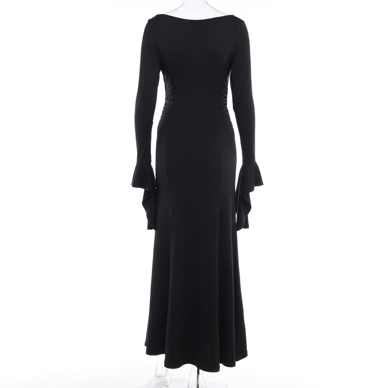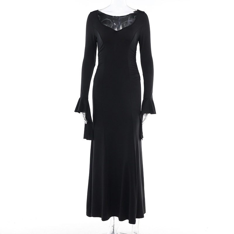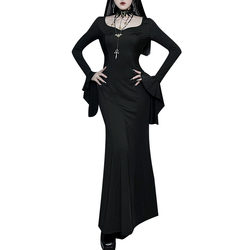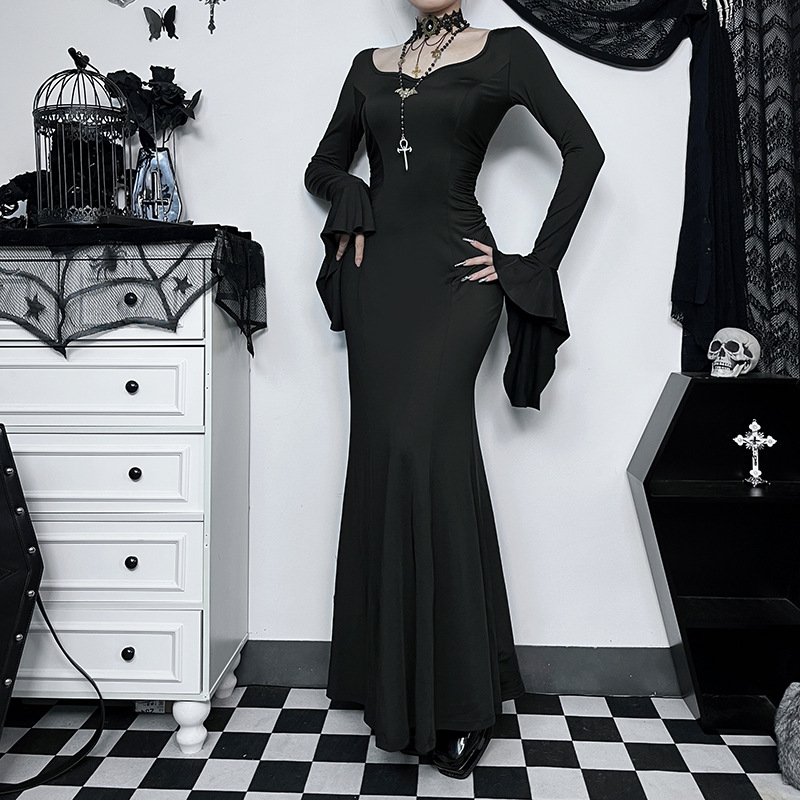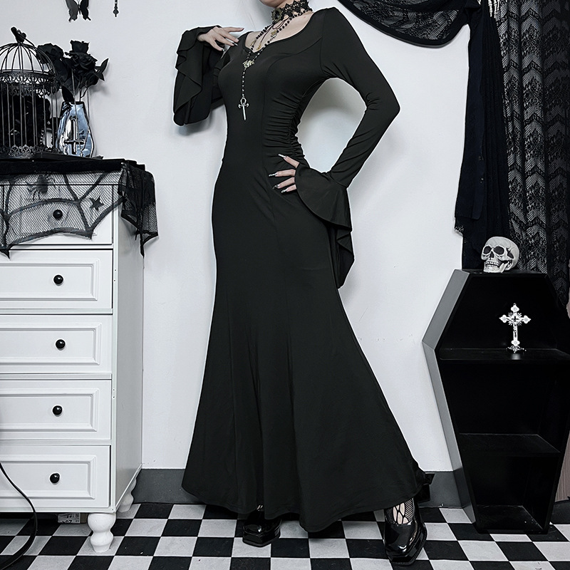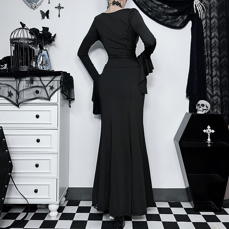 Halloween Gothic Dark Party Dress Women Aesthetic Vintage Elegant Nightclub Long Sleeve High Waist Trumpet Dress Female