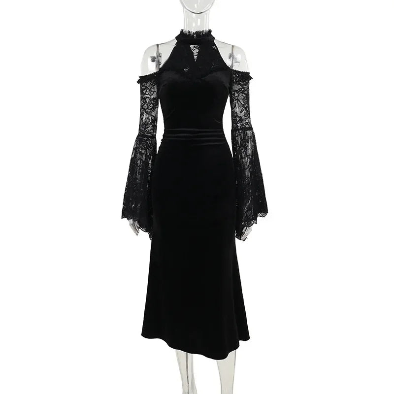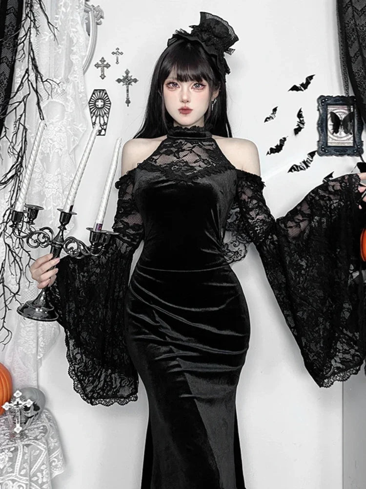 Halloween Long-sleeved Witch Dress for Women Fashion Elegant Evening Party Dresses Sexy Slim Fit Lace Splicing