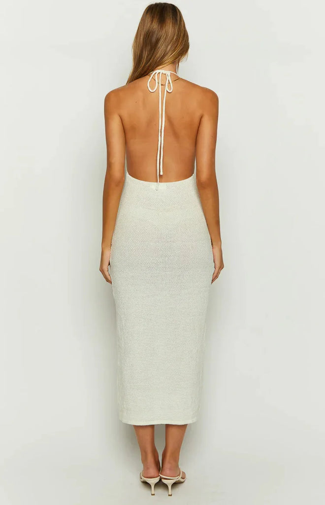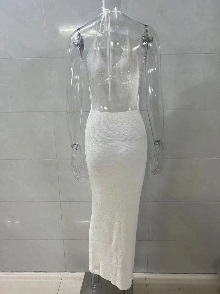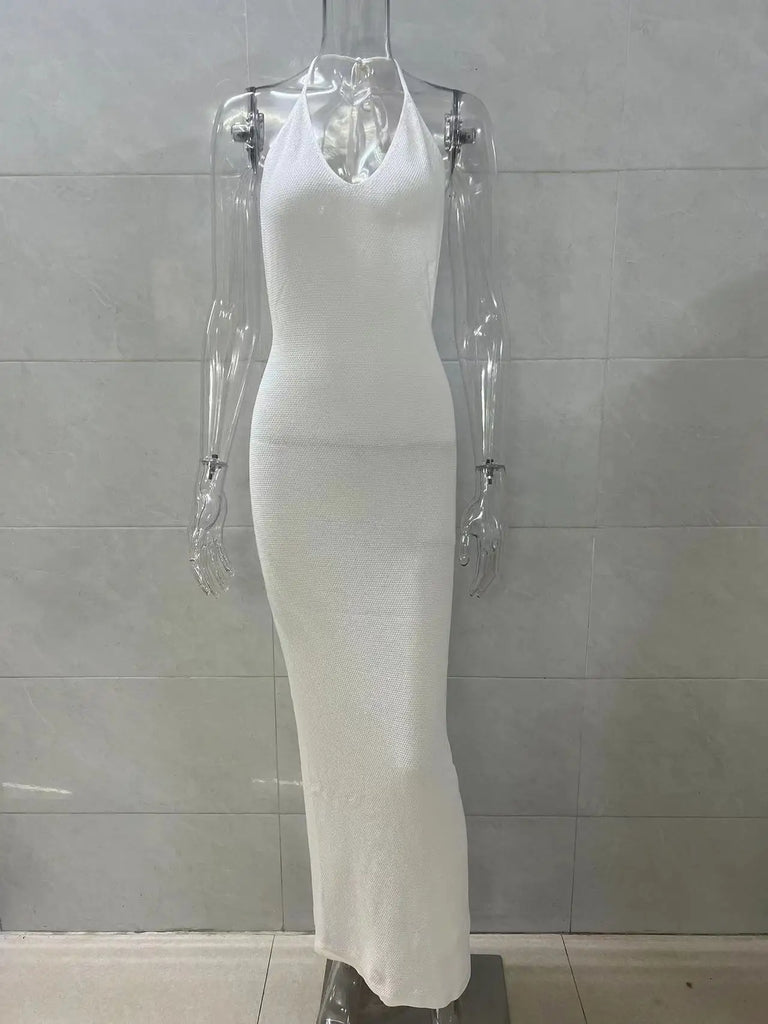 Halter Neck Knit Beach Long Dress Women Solid Color White Sleeveless Dresses For Vacation V Neck Bikini Swimming Sexy Cover-ups