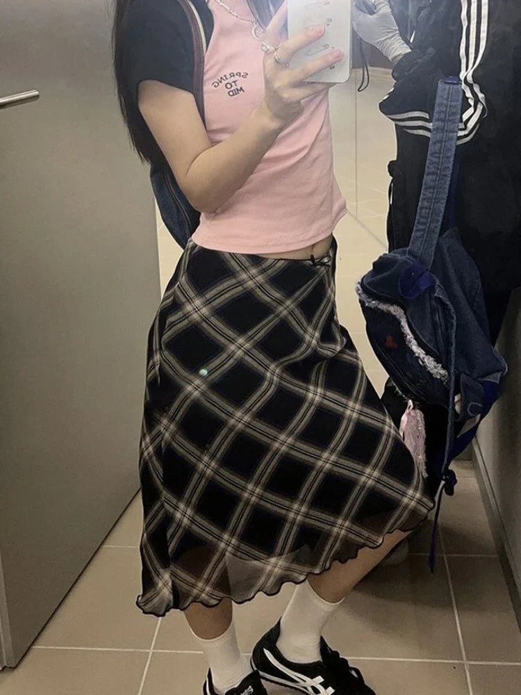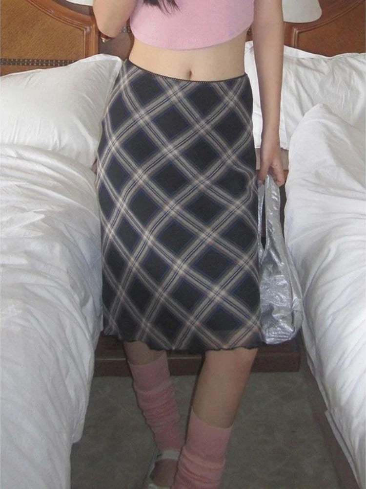 Y2k Vintage Plaid Skirt Women Summer Korean Style Casual Mesh Print High Waist Slim Midi Skirt Girl 90s Streetwear