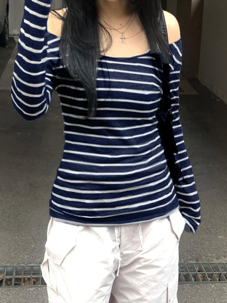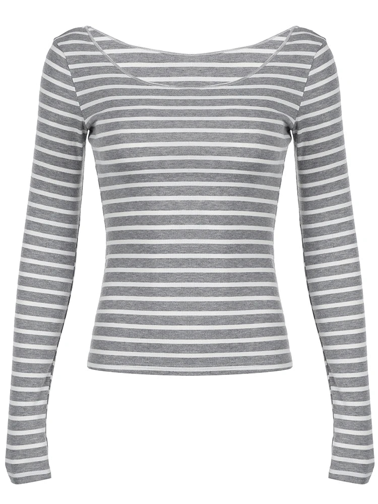 Japanese Basic Slim Long Sleeve Stripe Tee Off Shoulder O Neck Korean Street Style Spring Autumn Y2K Gray T Shirt Women