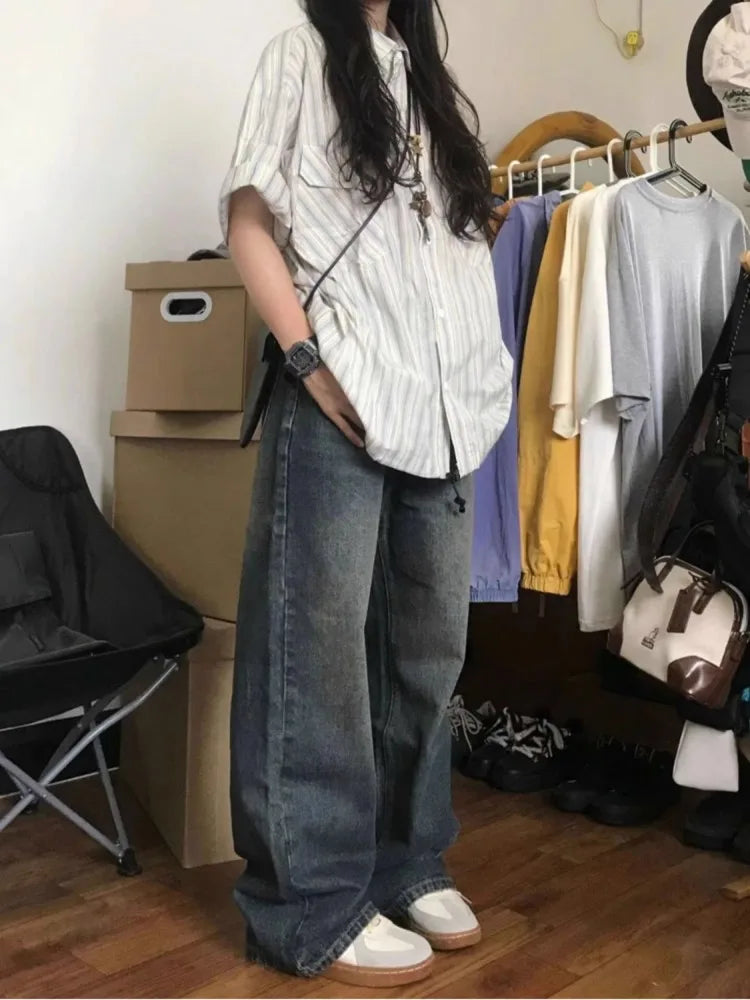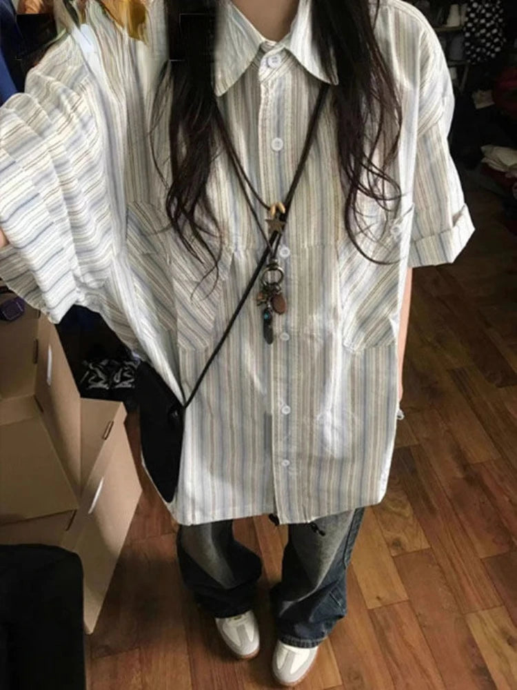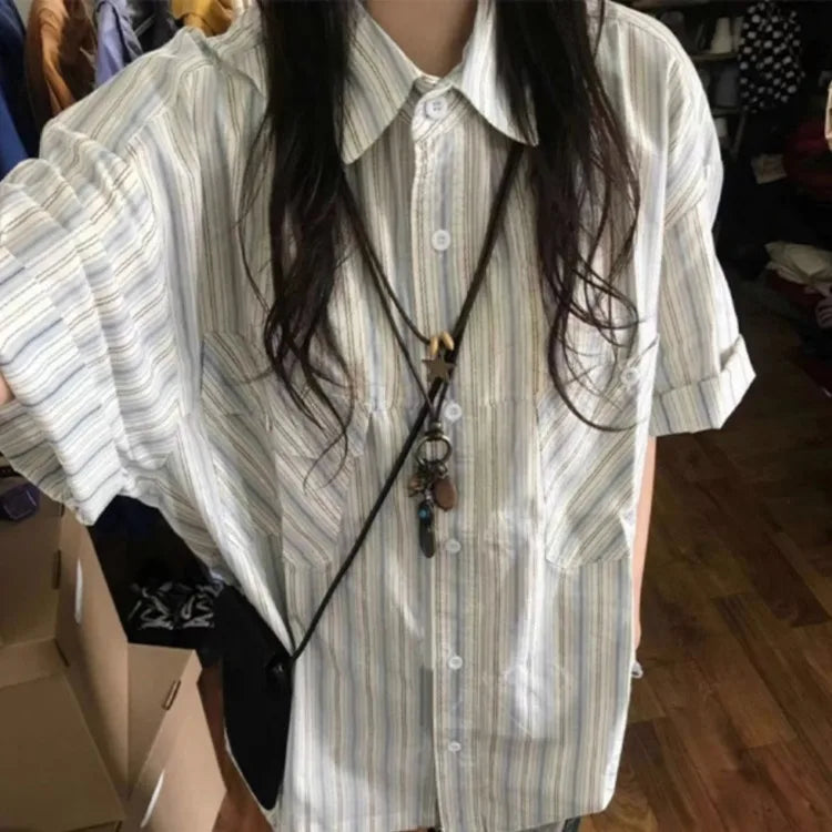 Japanese Retro Blue Striped Short Sleeved Blouses Summer New  Sleeve Shirts Women Y2k E-Girl Mid-length Loose Blusas Mujer
