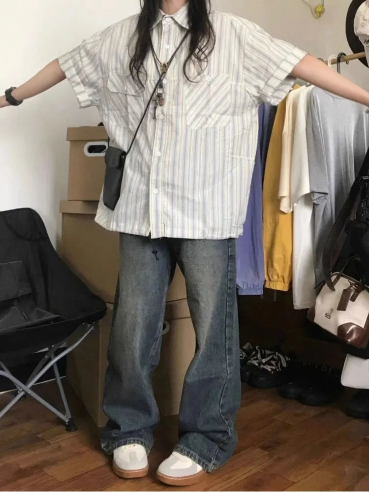 Japanese Retro Blue Striped Short Sleeved Blouses Summer New Sleeve Shirts Women Y2k E-Girl Mid-length Loose Blusas Mujer