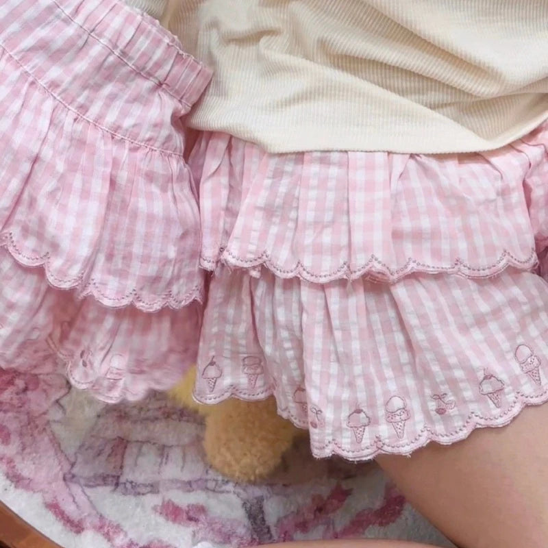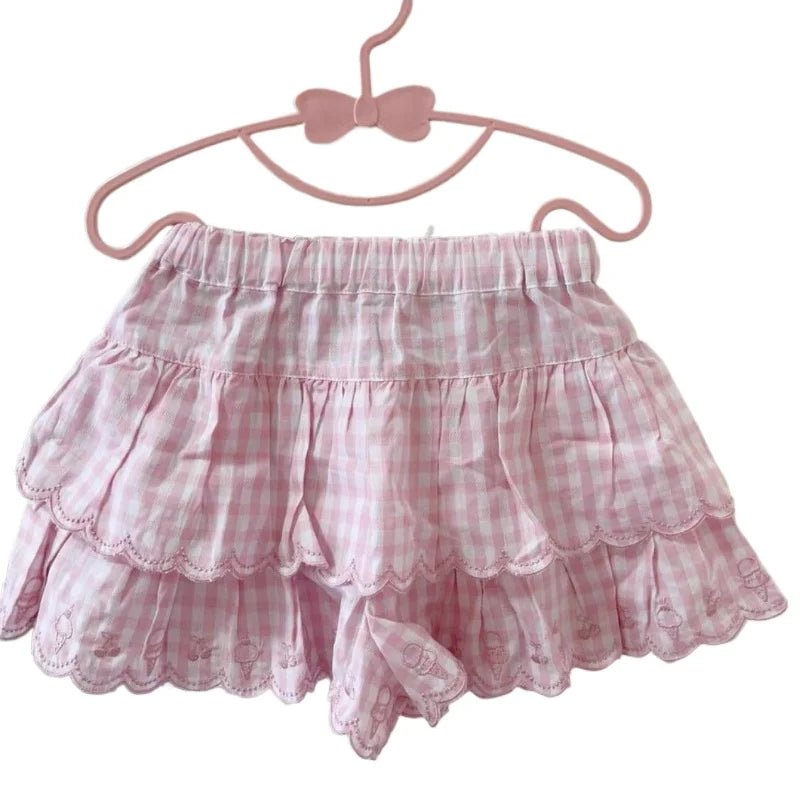 Japanese Style Kawaii Mini Skirt Women Sweet Harajuku Lolita Plaid Skirts Pink Y2k Cutecore Summer A-line Ruffle Skirts