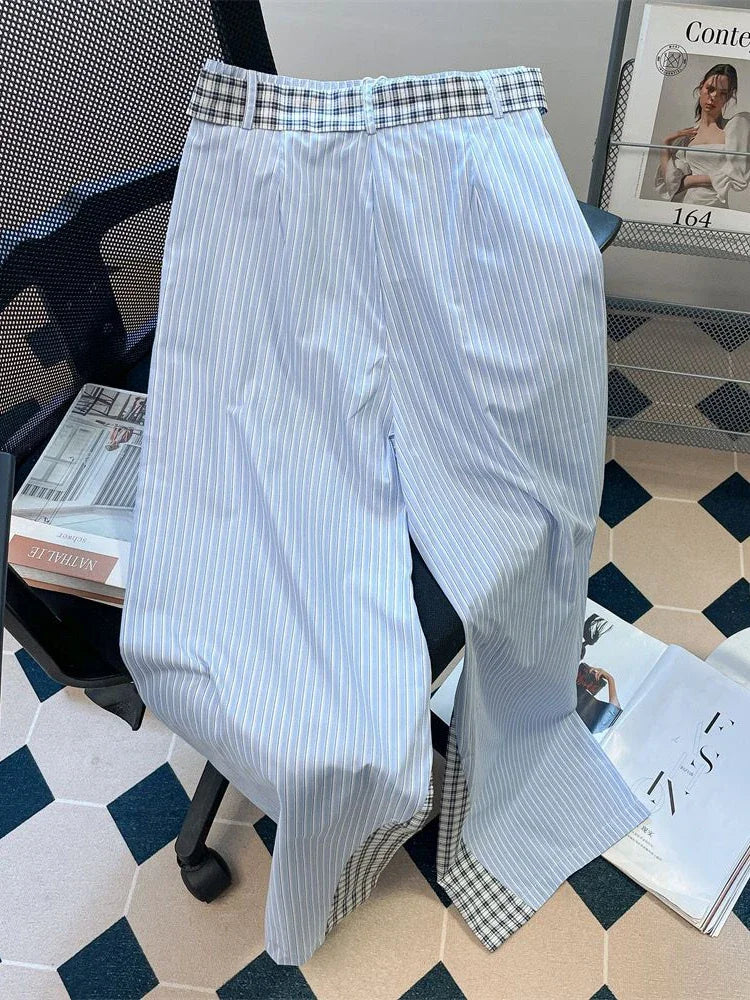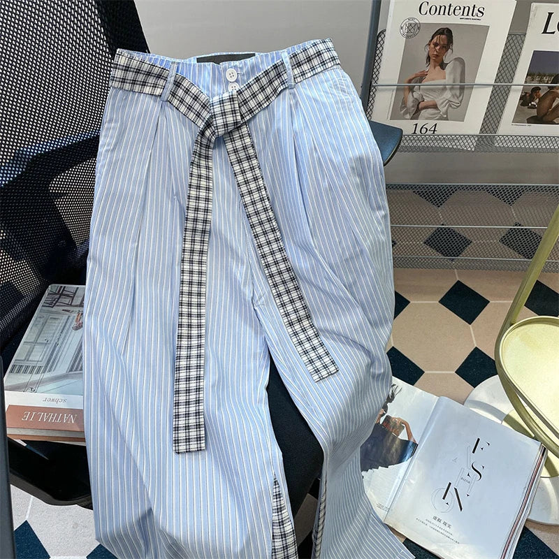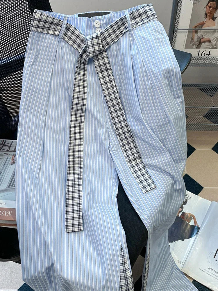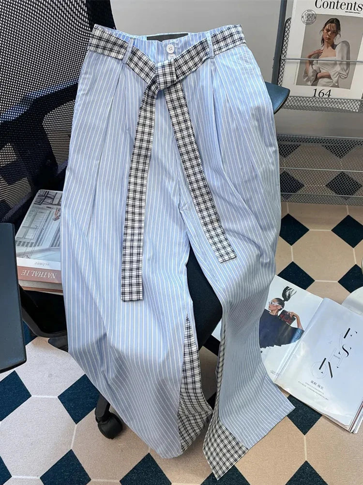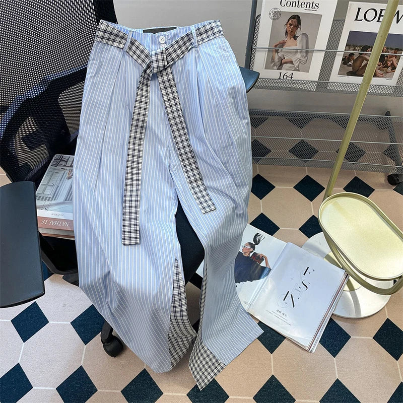 Jmprs Striped Patchwork Pants Women Korean Belt High Waist Straight Trousers Casual Loose Elegant Female Fashion Wide Leg Pants