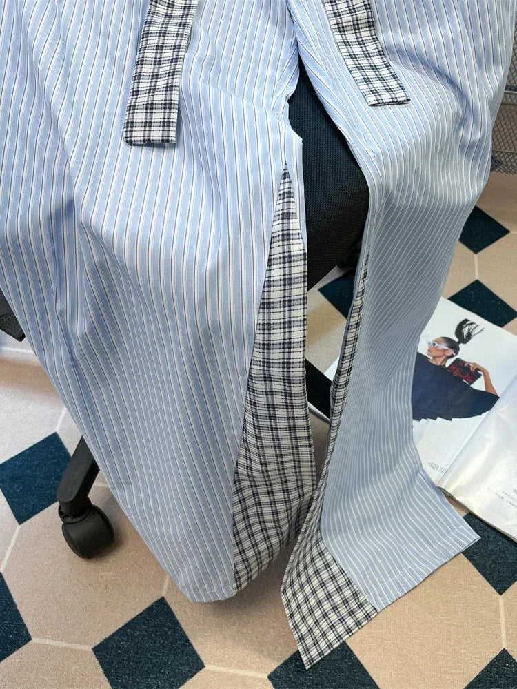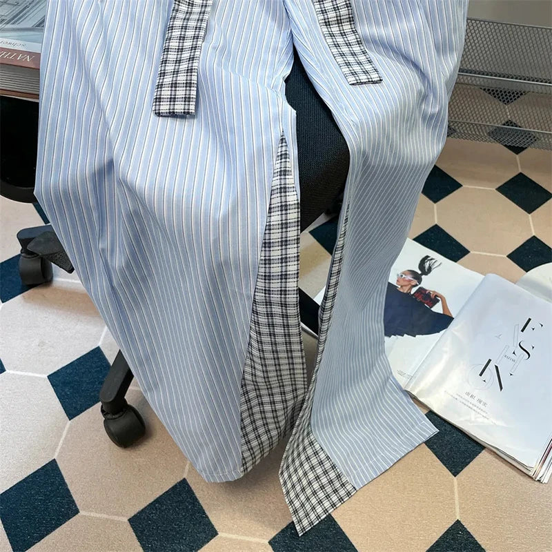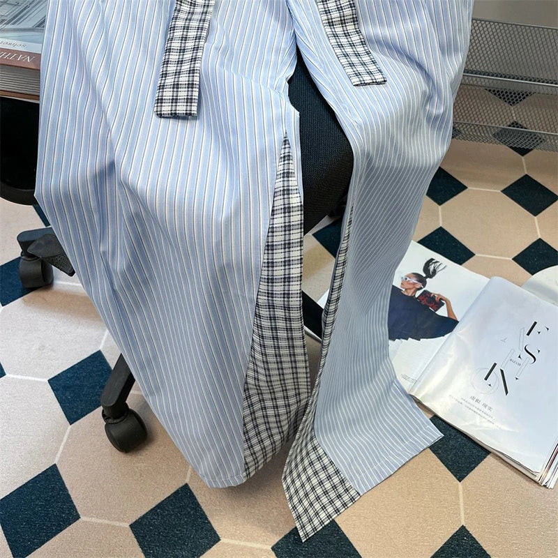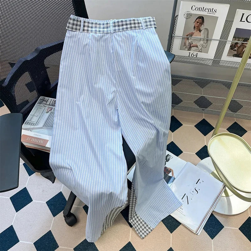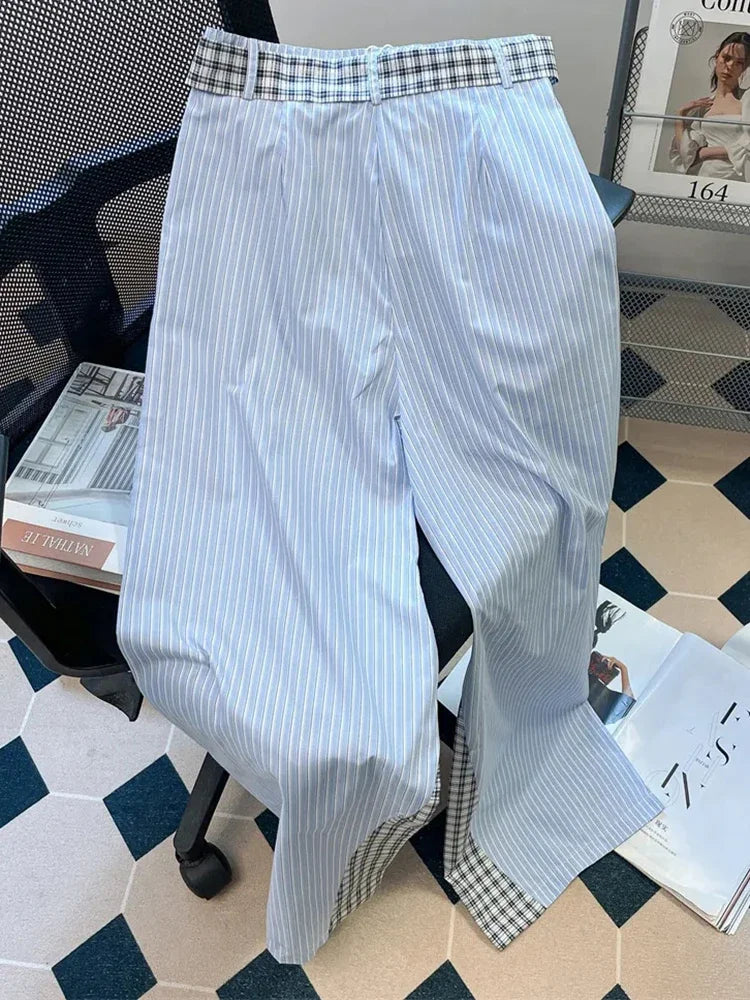 Jmprs Striped Patchwork Pants Women Korean Belt High Waist Straight Trousers Casual Loose Elegant Female Fashion Wide Leg Pants
