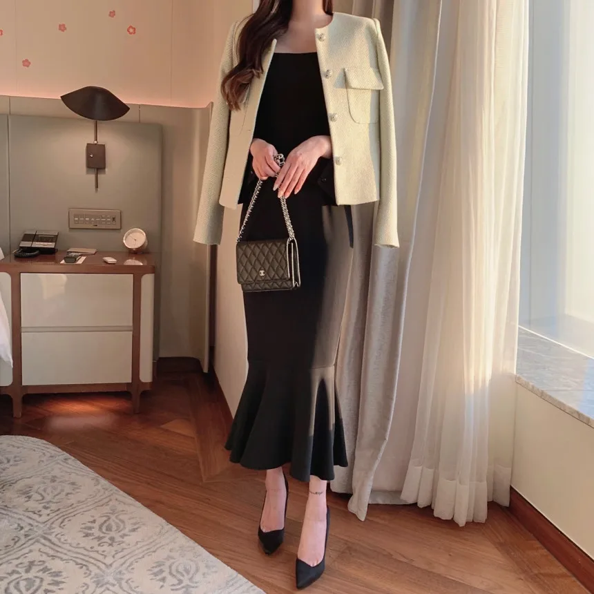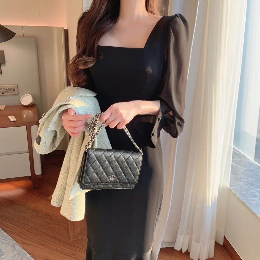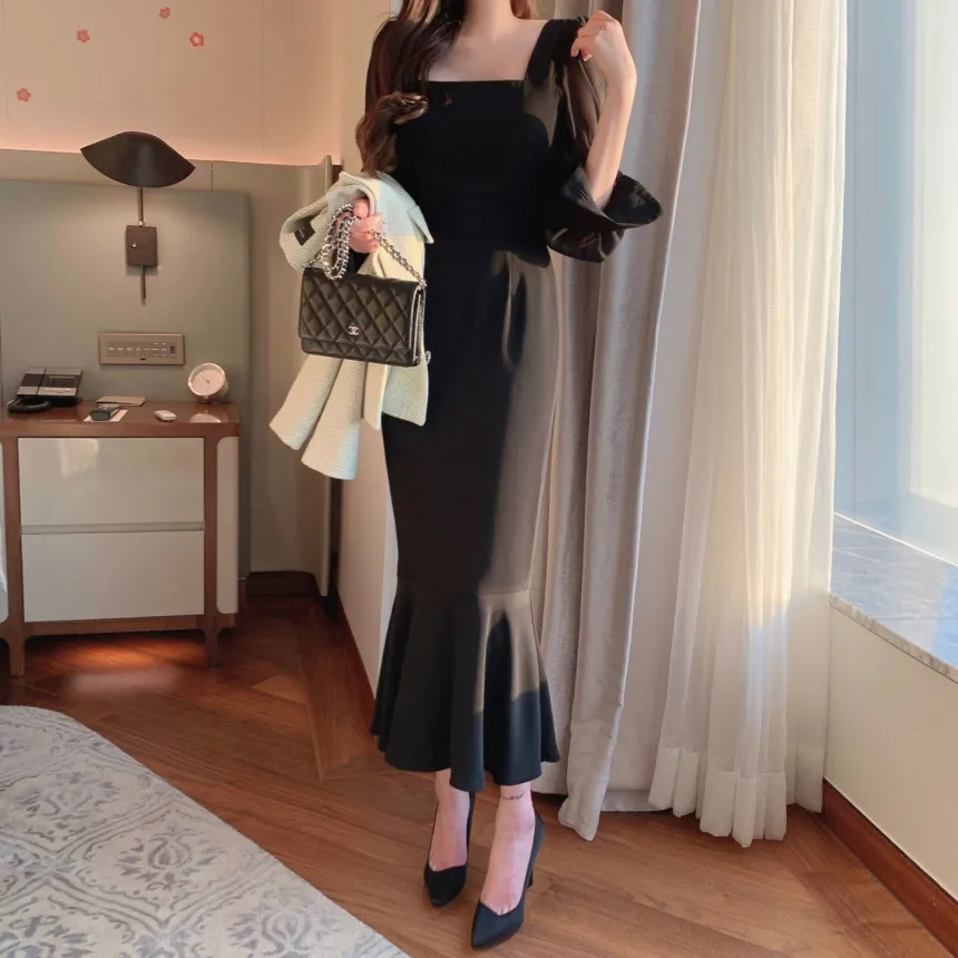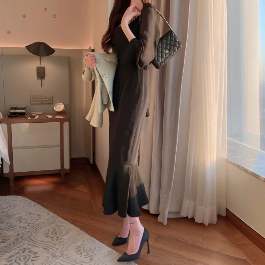 Korea Square Neck Bandage Trumpet Mermaid Chiffon Dresses for Women Elegant Puff Sleeve Solid Bodycon Dress Spring Clothing