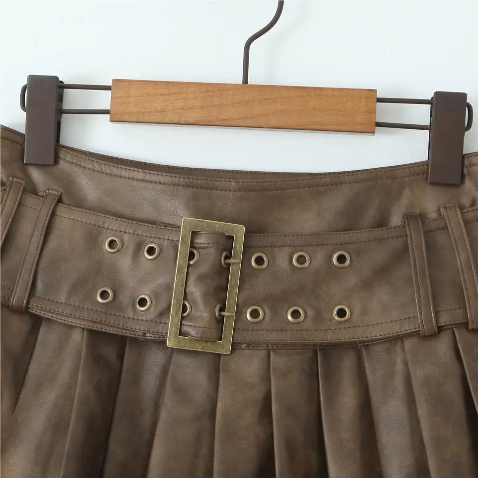 Korean Fashion Faux Leather Skirts For Woman Mini Skirts Low Waist Summer Vintage PU Leather Pleated Skirt With Belt Brown