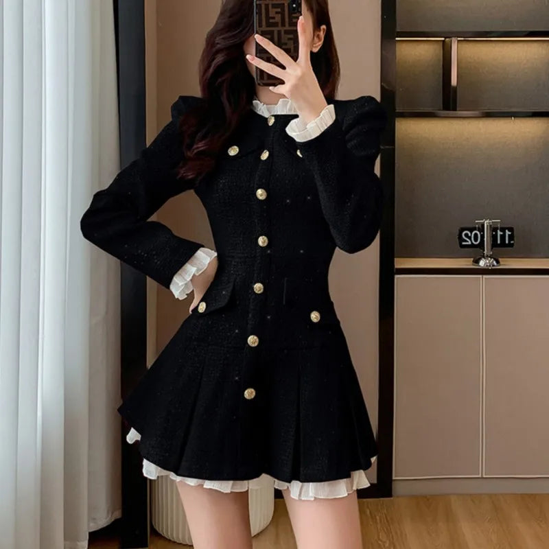 Korean Vintage Women Tweed Dresses 2025 Autumn New O-neck French Pleated A-line Party Short Dress Fashion Female Mini Vestidos