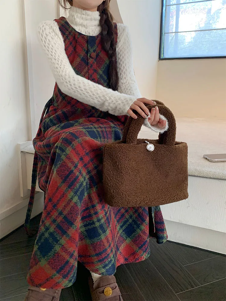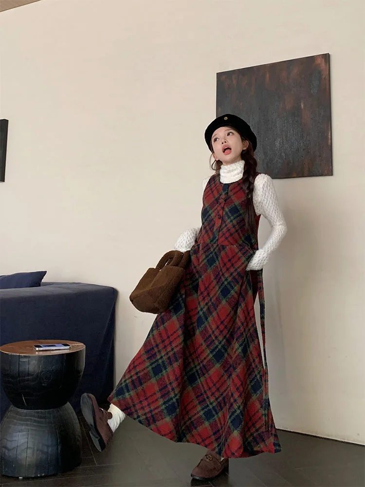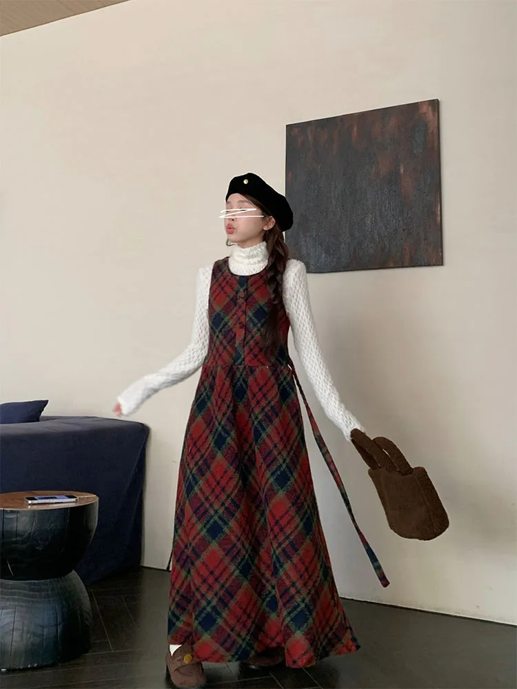 Winter Plaid A-line Skirt Women Clothing Woolen Vest Dress Sweet Age Reduction Vintage Dresses Korean Fashion Vestidos